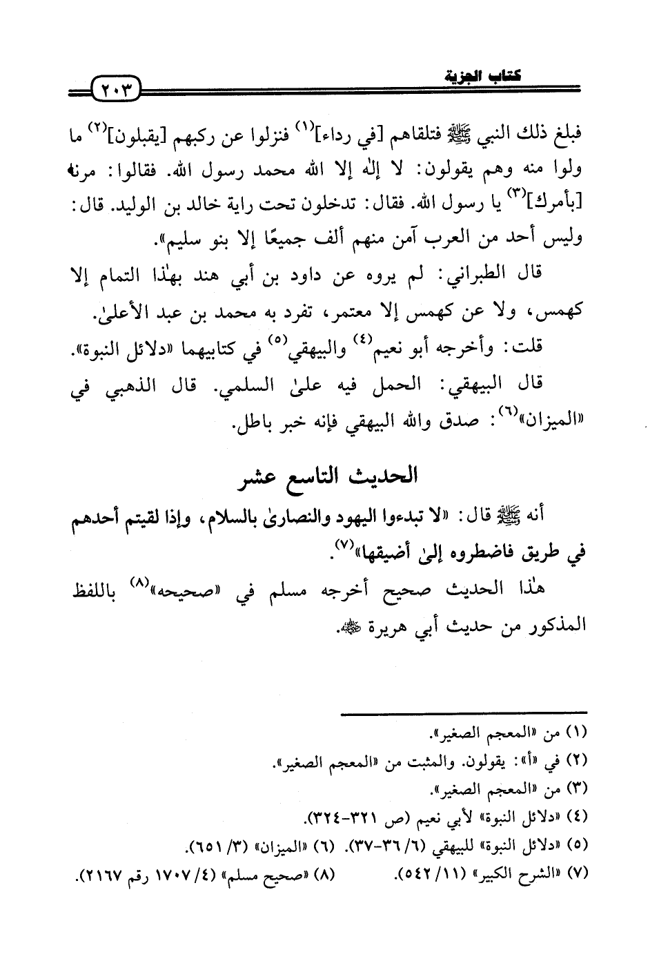 أنَّه - صَلَّى الله عَلَيْهِ وَسلم - قَالَ: «لَا تبدءوا الْيَهُود وَالنَّصَارَى بِالسَّلَامِ، وَإِذا لَقِيتُم أحدهم فِي طَرِيق فَاضْطَرُّوهُ إِلَى أضيقها» .