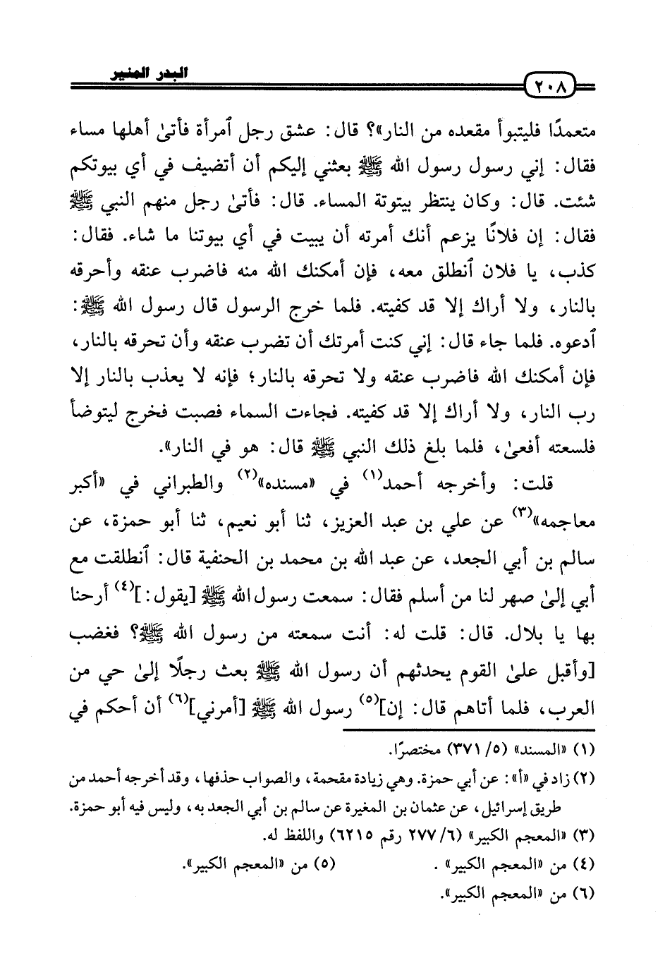 مُتَعَمدا فَليَتَبَوَّأ مَقْعَده من النَّار» ؟ قَالَ: عشق رجل امْرَأَة فَأَتَى أَهلهَا مسَاء فَقَالَ: إِنِّي رَسُول رَسُول الله - صَلَّى الله عَلَيْهِ وَسلم - بَعَثَنِي إِلَيْكُم أَن أتضيف فِي أَي بُيُوتكُمْ شِئْت. قَالَ: وَكَانَ ينْتَظر بيتوتة الْمسَاء. قَالَ: فَأَتَى رجل مِنْهُم النَّبِي - صَلَّى الله عَلَيْهِ وَسلم - فَقَالَ: إِن فلَانا يزْعم أَنَّك أَمرته أَن يبيت فِي أَي بُيُوتنَا مَا شَاءَ. فَقَالَ: كذب، يَا فلَان انْطلق مَعَه، فَإِن أمكنك الله مِنْهُ فَاضْرب عُنُقه وَأحرقهُ بالنَّار، وَلَا أَرَاك إِلَّا قد كفيته. فَلَمَّا خرج الرَّسُول قَالَ رَسُول الله - صَلَّى الله عَلَيْهِ وَسلم -: ادعوهُ. فَلَمَّا جَاءَ قَالَ: إِنِّي كنت أَمرتك أَن تضرب عُنُقه وَأَن تحرقه بالنَّار، فَإِن أمكنك الله فَاضْرب عُنُقه وَلَا تحرقه بالنَّار؛ فَإِنَّهُ لَا يعذب بالنَّار إِلَّا رب النَّار، وَلَا أَرَاك إِلَّا قد كفيته. فَجَاءَت السَّمَاء فصبت فَخرج ليتوضأ فلسعته أَفْعَى، فَلَمَّا بلغ ذَلِك النَّبِي - صَلَّى الله عَلَيْهِ وَسلم - قَالَ: هُوَ فِي النَّار» .