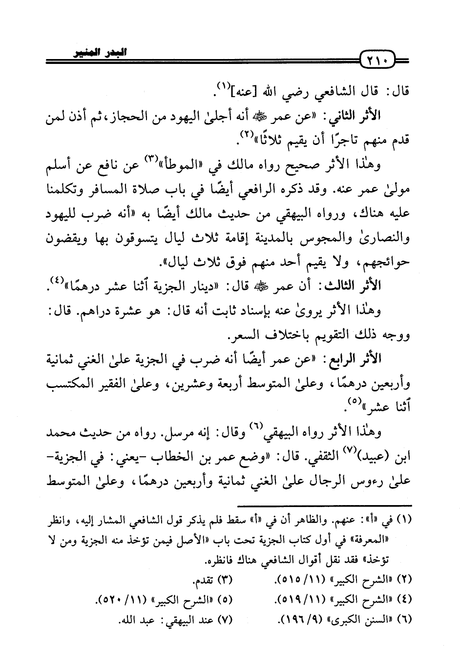 وَهَذَا الْأَثر صَحِيح رَوَاهُ مَالك فِي «الْمُوَطَّأ» عَن نَافِع عَن أسلم مولَى عمر عَنهُ. وَقد ذكره الرَّافِعِيّ أَيْضا فِي بَاب صَلَاة الْمُسَافِر وتكلمنا عَلَيْهِ هُنَاكَ، وَرَوَاهُ الْبَيْهَقِيّ من حَدِيث مَالك أَيْضا بِهِ «أَنه ضرب للْيَهُود وَالنَّصَارَى وَالْمَجُوس بِالْمَدِينَةِ إِقَامَة ثَلَاث لَيَال يتسوقون بهَا ويقضون حوائجهم، وَلَا يُقيم أحد مِنْهُم فَوق ثَلَاث لَيَال» .