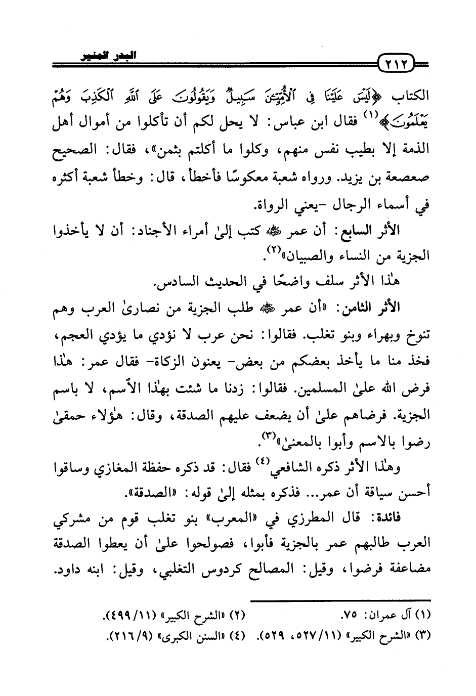 الْأَثر الثَّامِن: «أَن عمر رَضِيَ اللَّهُ عَنْه طلب الْجِزْيَة من نَصَارَى الْعَرَب وهم تنوخ وبهراء وَبَنُو تغلب. فَقَالُوا: نَحن عرب لَا نُؤَدِّي مَا يُؤَدِّي الْعَجم، فَخذ منا مَا يَأْخُذ بَعْضكُم من بعض - يعنون الزَّكَاة - فَقَالَ عمر: هَذَا فرض الله عَلَى الْمُسلمين. فَقَالُوا: زِدْنَا مَا شِئْت بِهَذَا الِاسْم، لَا باسم الْجِزْيَة. فرضاهم عَلَى أَن يضعف عَلَيْهِم الصَّدَقَة، وَقَالَ: هَؤُلَاءِ حمقى رَضوا بِالِاسْمِ وأبوا بِالْمَعْنَى» .