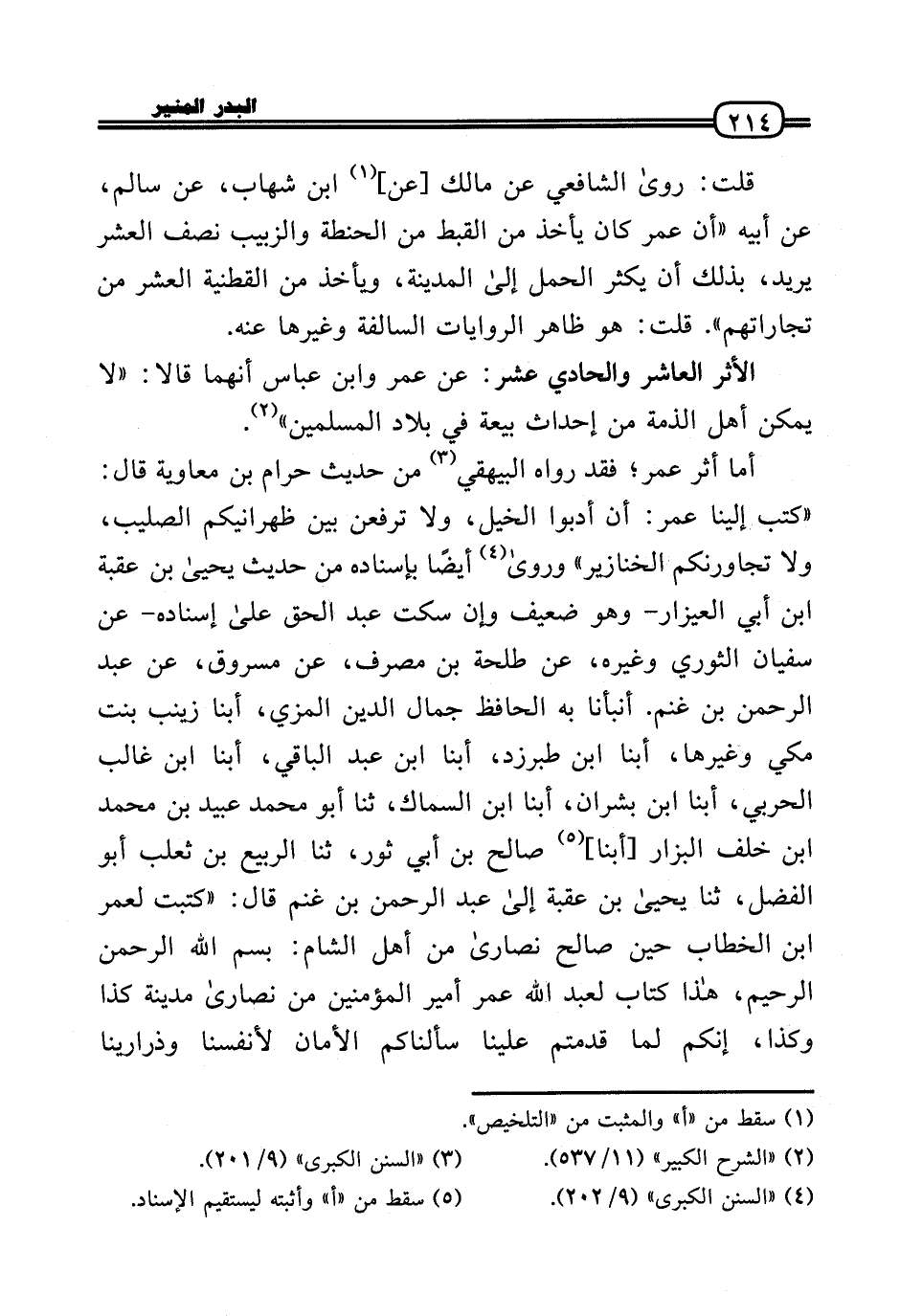 أما أثر عمر؛ فقد رَوَاهُ الْبَيْهَقِيّ من حَدِيث حرَام بن مُعَاوِيَة قَالَ: «كتب إِلَيْنَا عمر: أَن أدبوا الْخَيل، وَلَا ترفعن بَين ظهرانيكم الصَّلِيب، وَلَا تجاورنكم الْخَنَازِير» وَرَوَى أَيْضا بِإِسْنَادِهِ من حَدِيث يَحْيَى بن عقبَة بن أبي الْعيزَار - وَهُوَ ضَعِيف وَإِن سكت عبد الْحق عَلَى إِسْنَاده - عَن سُفْيَان الثَّوْريّ وَغَيره، عَن طَلْحَة بن مصرف، عَن مَسْرُوق، عَن عبد الرَّحْمَن بن غنم. أَنبأَنَا بِهِ الْحَافِظ جمال الدَّين الْمزي، أبنا زَيْنَب بنت مكي وَغَيرهَا، أبنا ابْن طبرزد، أبنا ابْن عبد الْبَاقِي، أبنا ابْن غَالب الْحَرْبِيّ، أبنا ابْن بَشرَان، أبنا ابْن السماك، ثَنَا أَبُو مُحَمَّد عبيد بن مُحَمَّد بن خلف الْبَزَّار [أبنا] صَالح بن أبي ثَوْر، ثَنَا الرّبيع بن ثَعْلَب أَبُو الْفضل، ثَنَا يَحْيَى بن عقبَة إِلَى عبد الرَّحْمَن بن غنم قَالَ: «كتبت لعمر بن الْخطاب حِين صَالح نَصَارَى من أهل الشَّام: بِسم الله الرَّحْمَن الرَّحِيم، هَذَا كتاب لعبد الله عمر أَمِير الْمُؤمنِينَ من نَصَارَى مَدِينَة كَذَا وَكَذَا، إِنَّكُم لما قدمتم علينا سألناكم الْأمان لأنفسنا وذرارينا