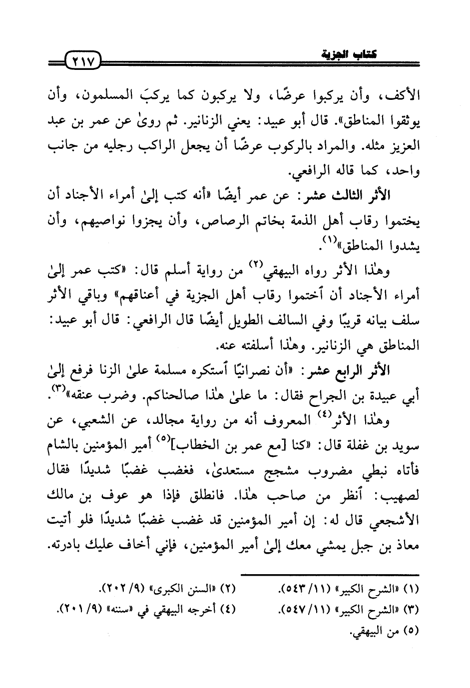 الْأَثر الثَّالِث عشر: عَن عمر أَيْضا «أَنه كتب إِلَى أُمَرَاء الأجناد أَن يختموا رِقَاب أهل الذِّمَّة بِخَاتم الرصاص، وَأَن يجزوا نواصيهم، وَأَن يشدوا المناطق» .