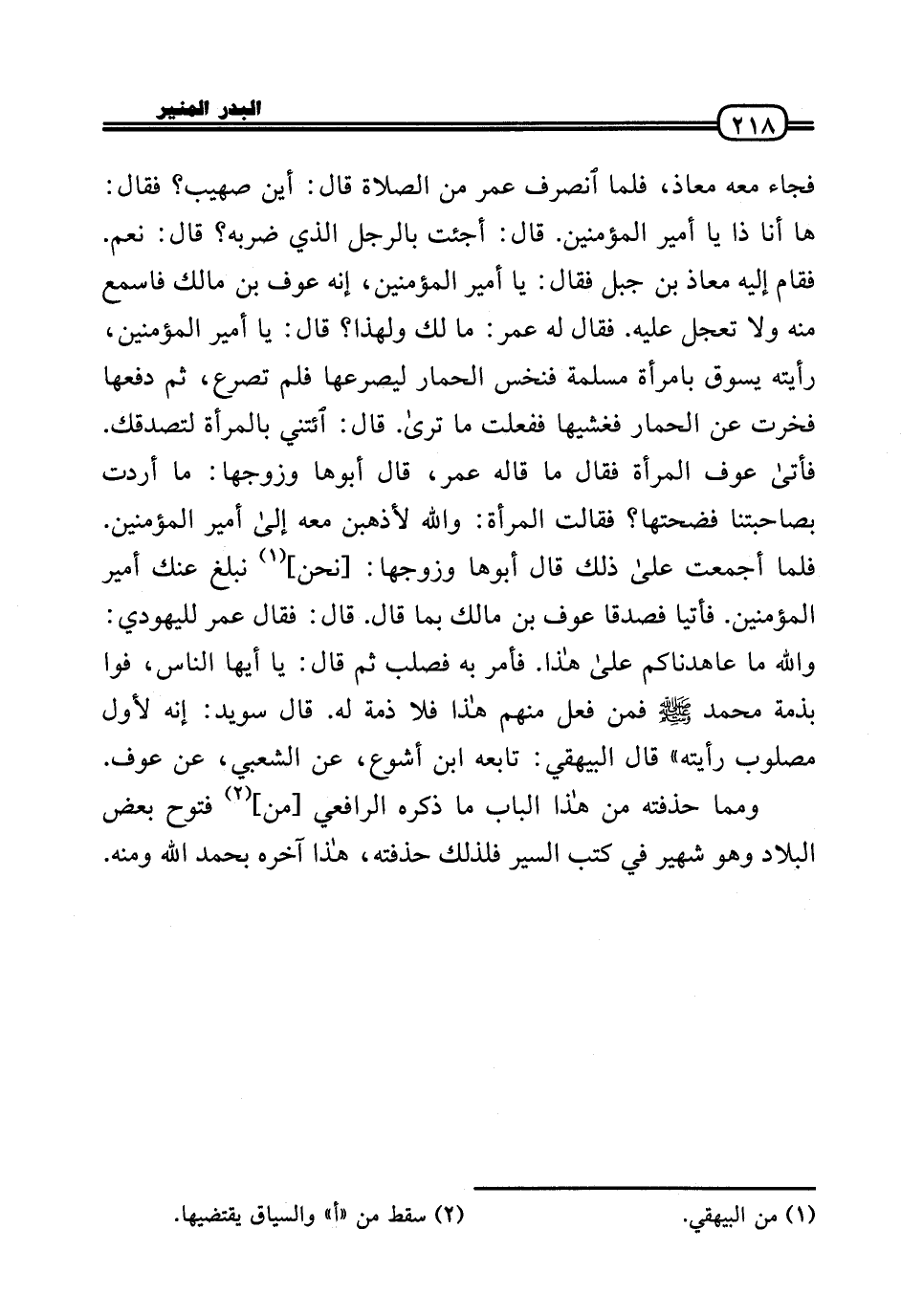 فجَاء مَعَه معَاذ، فَلَمَّا انْصَرف عمر من الصَّلَاة قَالَ: أَيْن صُهَيْب؟ فَقَالَ: هَا أَنا ذَا يَا أَمِير الْمُؤمنِينَ. قَالَ: أجئت بِالرجلِ الَّذِي ضربه؟ قَالَ: نعم. فَقَامَ إِلَيْهِ معَاذ بن جبل فَقَالَ: يَا أَمِير الْمُؤمنِينَ، إِنَّه عَوْف بن مَالك فاسمع مِنْهُ وَلَا تعجل عَلَيْهِ. فَقَالَ لَهُ عمر: مَا لَك وَلِهَذَا؟ قَالَ: يَا أَمِير الْمُؤمنِينَ، رَأَيْته يَسُوق بِامْرَأَة مسلمة فَنَخَسَ الْحمار ليصرعها فَلم تصرع، ثمَّ دَفعهَا فخرت عَن الْحمار فغشيها فَفعلت مَا ترَى. قَالَ: ائْتِنِي بِالْمَرْأَةِ لتصدقك. فَأَتَى عَوْف الْمَرْأَة فَقَالَ مَا قَالَه عمر، قَالَ أَبوهَا وَزوجهَا: مَا أردْت بصاحبتنا فضحتها؟ فَقَالَت الْمَرْأَة: وَالله لأذهبن مَعَه إِلَى أَمِير الْمُؤمنِينَ. فَلَمَّا أَجمعت عَلَى ذَلِك قَالَ أَبوهَا وَزوجهَا: [نَحن] نبلغ عَنْك أَمِير الْمُؤمنِينَ. فَأتيَا فصدقا عَوْف بن مَالك بِمَا قَالَ. قَالَ: فَقَالَ عمر لِلْيَهُودِيِّ: وَالله مَا عاهدناكم عَلَى هَذَا. فَأمر بِهِ فصلب ثمَّ قَالَ: يَا أَيهَا النَّاس، فوا بِذِمَّة مُحَمَّد (فَمن فعل مِنْهُم هَذَا فَلَا ذمَّة لَهُ. قَالَ سُوَيْد: إِنَّه لأوّل مصلوب رَأَيْته» قَالَ الْبَيْهَقِيّ: تَابعه ابْن أَشوع، عَن الشّعبِيّ، عَن عَوْف.