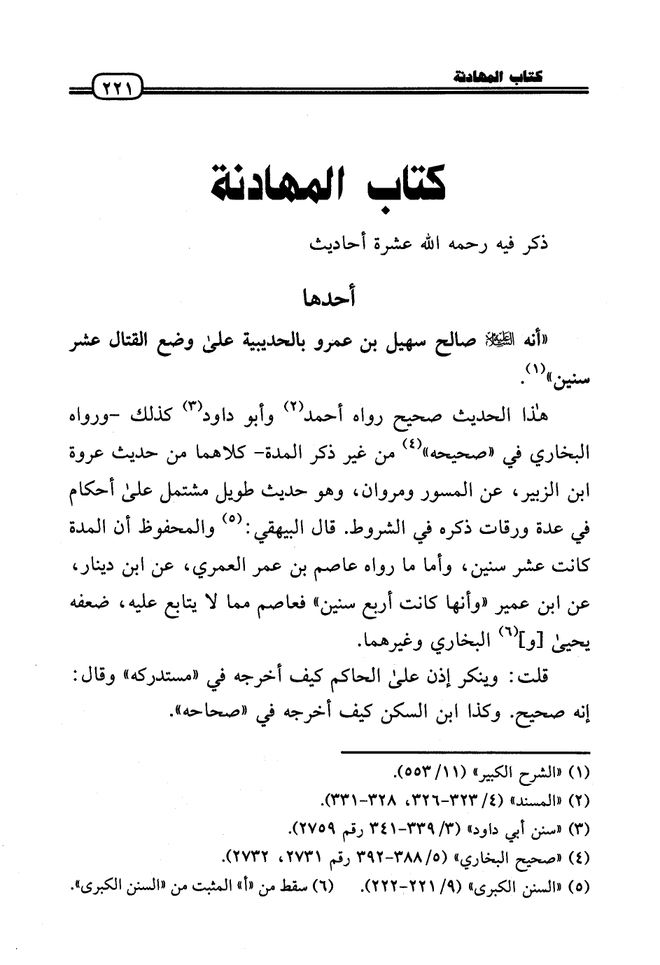 هَذَا الحَدِيث صَحِيح رَوَاهُ أَحْمد وَأَبُو دَاوُد كَذَلِك - وَرَوَاهُ البُخَارِيّ فِي «صَحِيحه» من غير ذكر الْمدَّة - كِلَاهُمَا من حَدِيث عُرْوَة بن الزبير، عَن الْمسور ومروان، وَهُوَ حَدِيث طَوِيل مُشْتَمل عَلَى أَحْكَام فِي عدَّة وَرَقَات ذكره فِي الشُّرُوط. قَالَ الْبَيْهَقِيّ: وَالْمَحْفُوظ أَن الْمدَّة كَانَت عشر سِنِين، وَأما مَا رَوَاهُ عَاصِم بن عمر الْعمريّ، عَن ابْن دِينَار، عَن ابْن عُمَيْر «وَأَنَّهَا كَانَت أَربع سِنِين» فعاصم مِمَّا لَا يُتَابع عَلَيْهِ، ضعفه يَحْيَى [و] البُخَارِيّ وَغَيرهمَا.