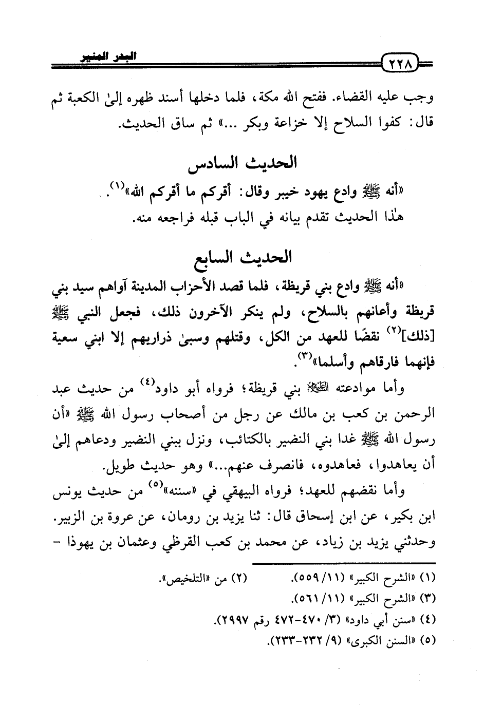«أنَّه - صَلَّى الله عَلَيْهِ وَسلم - وادع بني قُرَيْظَة، فَلَمَّا قصد الْأَحْزَاب الْمَدِينَة آواهم سيد بني قُرَيْظَة وَأَعَانَهُمْ بِالسِّلَاحِ، وَلم يُنكر الْآخرُونَ ذَلِك، فَجعل النَّبِي - صَلَّى الله عَلَيْهِ وَسلم -[ذَلِك] نقضا للْعهد من الْكل، وقتلهم وسبى ذَرَارِيهمْ إِلَّا ابْني سعية فَإِنَّهُمَا فارقاهم وأسلما» .