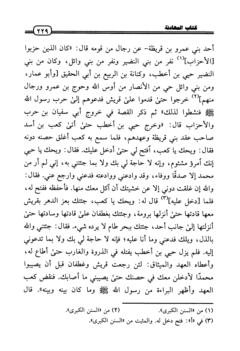 أحد بني عَمْرو بن قُرَيْظَة - عَن رجال من قومه قَالَ: «كَانَ الَّذين حزبوا [الْأَحْزَاب] نفر من بني النَّضِير وَنَفر من بني وَائِل، وَكَانَ من بني النَّضِير حييّ بن أَخطب، وكنانة بن الرّبيع بن أبي الْحقيق [وَأَبُو عمار، وَمن بني وَائِل حَيّ من الْأَنْصَار من أَوْس الله وحوج بن عَمْرو وَرِجَال مِنْهُم] خَرجُوا حَتَّى قدمُوا عَلَى قُرَيْش فدعوهم إِلَى حَرْب رَسُول الله - صَلَّى الله عَلَيْهِ وَسلم - فنشطوا لذَلِك» ثمَّ ذكر الْقِصَّة فِي خُرُوج أبي سُفْيَان بن حَرْب والأحزاب قَالَ: «وَخرج حييّ بن أَخطب حَتَّى أَتَى كَعْب بن أَسد صَاحب عقد بني قُرَيْظَة وَعَهْدهمْ، فَلَمَّا سمع بِهِ كَعْب أغلق حصنه دونه فَقَالَ: وَيحك يَا كَعْب، افْتَحْ لي حَتَّى أَدخل عَلَيْك. فَقَالَ: وَيحك يَا حييّ إِنَّك امْرُؤ مشئوم، وَإنَّهُ لَا حَاجَة لي بك وَلَا بِمَا جئتني بِهِ، إِنِّي لم أر من مُحَمَّد إِلَّا صدقا ووفاء، وَقد وادعني ووادعته فَدَعْنِي وارجع عني. فَقَالَ: وَالله إِن غلقت دوني إِلَّا عَن خشيتك أَن آكل مَعَك مِنْهَا. فأحفظه فَفتح لَهُ، فَلَمَّا [دخل عَلَيْهِ] قَالَ لَهُ: وَيحك يَا كَعْب، جئْتُك بعز الدَّهْر بِقُرَيْش مَعهَا قادتها حَتَّى أنزلهَا برومة، وجئتك بغطفان عَلَى قادتها وسادتها حَتَّى أنزلتها إِلَى جَانب أحد، جئْتُك ببحر طام لَا يردهُ شَيْء. فَقَالَ: جئتني وَالله بالذل، وَيلك فَدَعْنِي وَمَا أَنا عَلَيْهِ؛ فَإِنَّهُ لَا حَاجَة لي بك وَلَا بِمَا تَدعُونِي إِلَيْهِ. فَلم يزل حييّ بن أَخطب يفتله فِي الذرْوَة وَالْغَارِب حَتَّى أطَاع لَهُ، وَأَعْطَاهُ الْعَهْد والميثاق: لَئِن رجعت قُرَيْش وغَطَفَان قبل أَن يُصِيبُوا مُحَمَّدًا لأدخلن مَعَك فِي حصنك حَتَّى يُصِيبنِي مَا أَصَابَك. فنقض كَعْب الْعَهْد وَأظْهر الْبَرَاءَة من رَسُول الله - صَلَّى الله عَلَيْهِ وَسلم - وَمَا كَانَ بَينه وَبَينه» . قَالَ