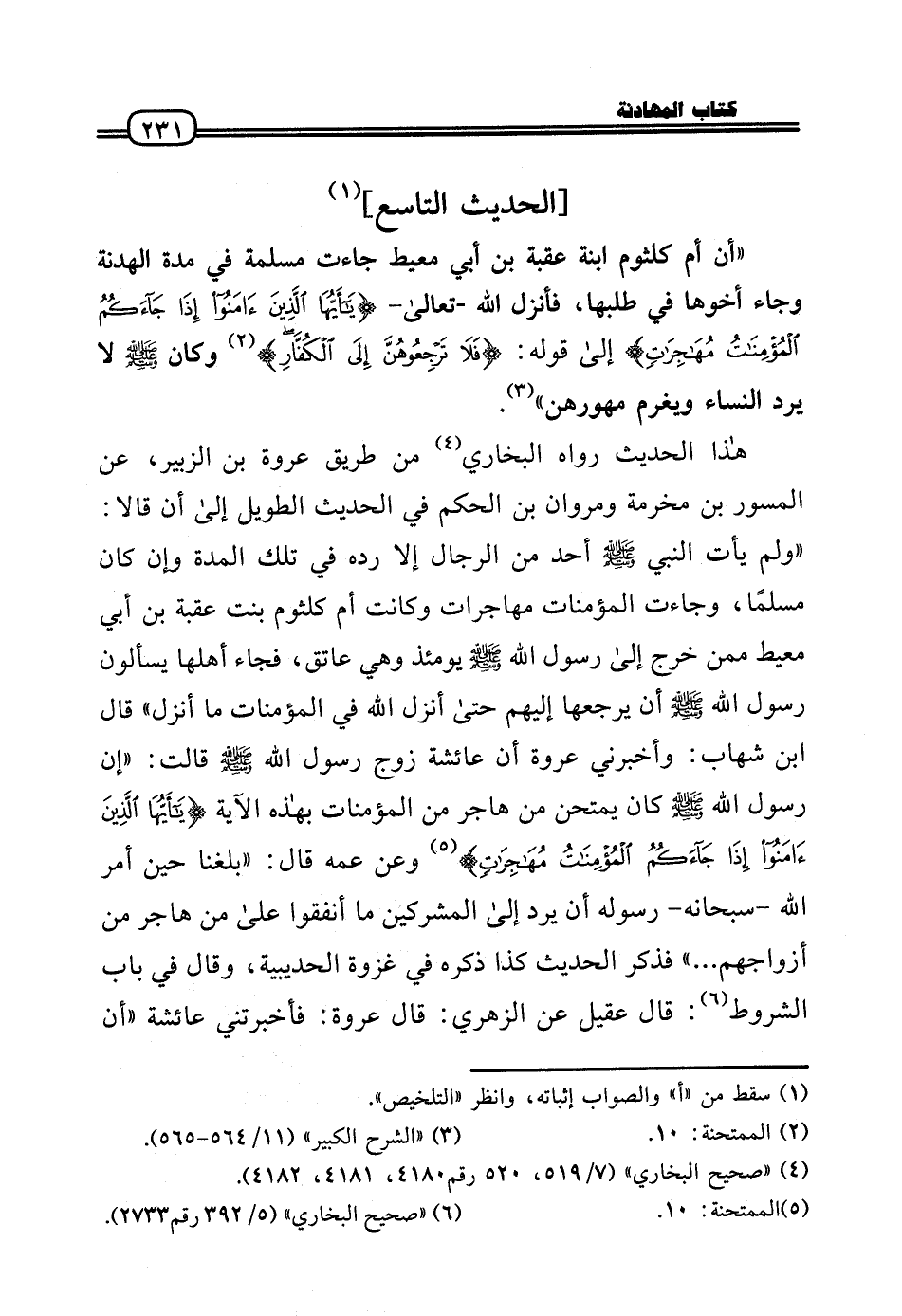 هَذَا الحَدِيث رَوَاهُ البُخَارِيّ من طَرِيق عُرْوَة بن الزبير، عَن الْمسور بن مخرمَة ومروان بن الحكم فِي الحَدِيث الطَّوِيل إِلَى أَن قَالَا: «وَلم يَأْتِ النَّبِي - صَلَّى الله عَلَيْهِ وَسلم - أحد من الرِّجَال إِلَّا رده فِي تِلْكَ الْمدَّة وَإِن كَانَ مُسلما، وَجَاءَت الْمُؤْمِنَات مهاجرات وَكَانَت أم كُلْثُوم بنت عقبَة بن أبي معيط مِمَّن خرج إِلَى رَسُول الله - صَلَّى الله عَلَيْهِ وَسلم - يَوْمئِذٍ وَهِي عاتق، فجَاء أَهلهَا يسْأَلُون رَسُول الله - صَلَّى الله عَلَيْهِ وَسلم - أَن يرجعها إِلَيْهِم حَتَّى أنزل الله فِي الْمُؤْمِنَات مَا أنزل» قَالَ ابْن شهَاب: وَأَخْبرنِي عُرْوَة أَن عَائِشَة زوج رَسُول الله - صَلَّى الله عَلَيْهِ وَسلم - قَالَت: «إِن رَسُول الله - صَلَّى الله عَلَيْهِ وَسلم - كَانَ يمْتَحن من هَاجر من الْمُؤْمِنَات بِهَذِهِ الْآيَة (يَا أَيهَا النَّبِي إِذا جَاءَك الْمُؤْمِنَات مهاجرات» ) وَعَن عَمه قَالَ: «بلغنَا حِين أَمر الله - سُبْحَانَهُ - رَسُوله أَن يرد إِلَى الْمُشْركين مَا أَنْفقُوا عَلَى من هَاجر من أَزوَاجهم ... » فَذكر الحَدِيث كَذَا ذكره فِي غَزْوَة الْحُدَيْبِيَة، وَقَالَ فِي بَاب الشُّرُوط: قَالَ عقيل عَن الزُّهْرِيّ: قَالَ عُرْوَة: فأخبرتني عَائِشَة «أَن