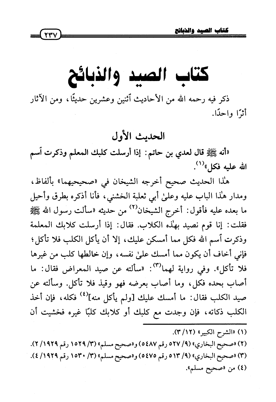 هَذَا الحَدِيث صَحِيح أخرجه الشَّيْخَانِ فِي «صَحِيحَيْهِمَا» بِأَلْفَاظ، ومدار هَذَا الْبَاب عَلَيْهِ وَعَلَى أبي ثَعْلَبَة الْخُشَنِي، فَأَنا أذكرهُ بطرق وأحيل مَا بعده عَلَيْهِ فَأَقُول: أخرج الشَّيْخَانِ من حَدِيثه «سَأَلت رَسُول الله - صَلَّى الله عَلَيْهِ وَسلم - فَقلت: إِنَّا قوم نصيد بِهَذِهِ الْكلاب. فَقَالَ: إِذا أرْسلت كلابك المعلمة وَذكرت اسْم الله فَكل مِمَّا أمسكن عَلَيْك، إِلَّا أَن يَأْكُل الْكَلْب فَلَا تَأْكُل؛ فَإِنِّي أَخَاف أَن يكون مِمَّا أمسك عَلَى نَفسه، وَإِن خالطها كلب من غَيرهَا فَلَا تَأْكُل» . وَفِي رِوَايَة لَهما: «سَأَلته عَن صيد المعراض فَقَالَ: مَا أصَاب بحده فَكل، وَمَا أصَاب بعرضه فَهُوَ وقيذ فَلَا تَأْكُل. وَسَأَلته عَن صيد الْكَلْب فَقَالَ: مَا أمسك عَلَيْك [وَلم يَأْكُل مِنْهُ] فكله، فَإِن أَخذ الْكَلْب ذَكَاته، فَإِن وجدت مَعَ كلبك أَو كلابك كَلْبا غَيره فَخَشِيت أَن