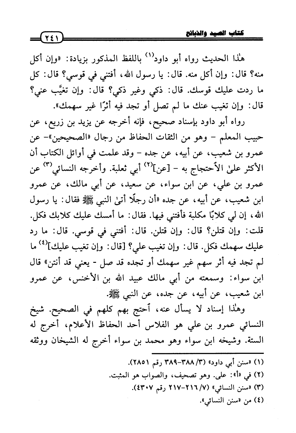 رَوَاهُ أَبُو دَاوُد بِإِسْنَاد صَحِيح، فَإِنَّهُ أخرجه عَن يزِيد بن زُرَيْع، عَن حبيب الْمعلم - وَهُوَ من الثِّقَات الْحفاظ من رجال «الصَّحِيحَيْنِ» - عَن عَمْرو بن شُعَيْب، عَن أَبِيه، عَن جده - وَقد علمت فِي أَوَائِل الْكتاب أَن الْأَكْثَر عَلَى الِاحْتِجَاج بِهِ -[عَن] أبي ثَعْلَبَة. وَأخرجه النَّسَائِيّ عَن عَمْرو بن عَلّي، عَن ابْن سَوَاء، عَن سعيد، عَن أبي مَالك، عَن عَمْرو بن شُعَيْب، عَن أَبِيه، عَن جده «أَن رجلا أَتَى النَّبِي - صَلَّى الله عَلَيْهِ وَسلم - فَقَالَ: يَا رَسُول الله، إِن لي كلابًا مكلبة فأفتني فِيهَا. فَقَالَ: مَا أمسك عَلَيْك كلابك فَكل. قلت: وَإِن قتلن؟ قَالَ: وَإِن قتلن. قَالَ: أَفْتِنِي فِي قوسي. قَالَ: مَا رد عَلَيْك سهمك فَكل. قَالَ: وَإِن تغيب عَلّي؟ [قَالَ: وَإِن تغيب عَلَيْك] مَا لم تَجِد فِيهِ أثر سهم غير سهمك أَو تَجدهُ قد صل - يَعْنِي قد أنتن» قَالَ ابْن سَوَاء: وسمعته من أبي مَالك عبيد الله بن الْأَخْنَس، عَن عَمْرو بن شُعَيْب، عَن أَبِيه، عَن جده، عَن النَّبِي - صَلَّى الله عَلَيْهِ وَسلم -.