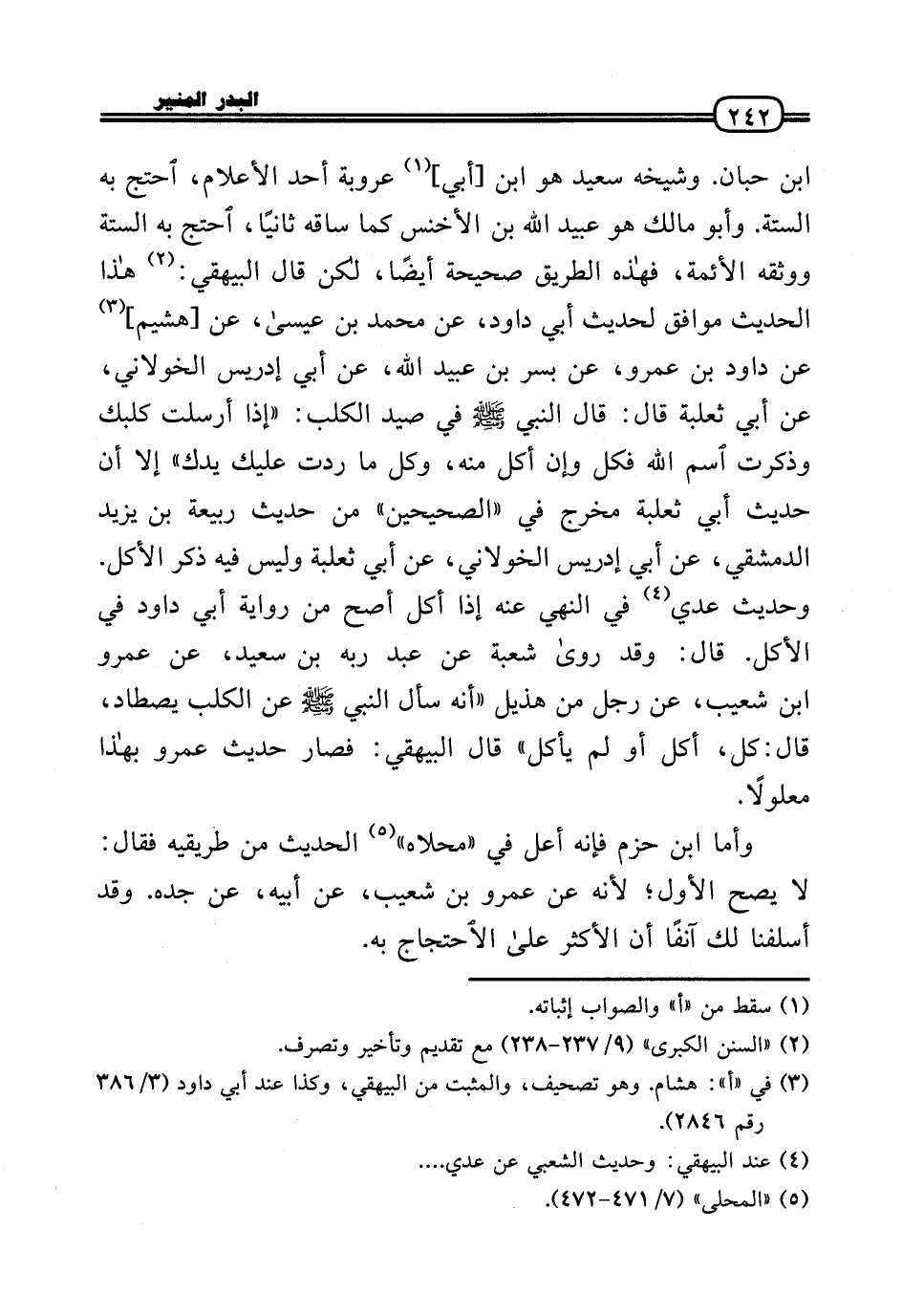 ابْن حبَان. وَشَيْخه سعيد هُوَ ابْن [أبي] عرُوبَة أحد الْأَعْلَام، احْتج بِهِ السِّتَّة. وَأَبُو مَالك هُوَ عبيد الله بن الْأَخْنَس كَمَا سَاقه ثَانِيًا، احْتج بِهِ السِّتَّة وَوَثَّقَهُ الْأَئِمَّة، فَهَذِهِ الطَّرِيق صَحِيحَة أَيْضا، لَكِن قَالَ الْبَيْهَقِيّ: هَذَا الحَدِيث مُوَافق لحَدِيث أبي دَاوُد، عَن مُحَمَّد بن عِيسَى، عَن [هشيم] عَن دَاوُد بن عَمْرو، عَن بسر بن عبيد الله، عَن أبي إِدْرِيس الْخَولَانِيّ، عَن أبي ثَعْلَبَة قَالَ: قَالَ النَّبِي - صَلَّى الله عَلَيْهِ وَسلم - فِي صيد الْكَلْب: «إِذا أرْسلت كلبك وَذكرت اسْم الله فَكل وَإِن أكل مِنْهُ، وكل مَا ردَّتْ عَلَيْك يدك» إِلَّا أَن حَدِيث أبي ثَعْلَبَة مخرج فِي «الصَّحِيحَيْنِ» من حَدِيث ربيعَة بن يزِيد الدِّمَشْقِي، عَن أبي إِدْرِيس الْخَولَانِيّ، عَن أبي ثَعْلَبَة وَلَيْسَ فِيهِ ذكر الْأكل. وَحَدِيث عدي فِي النَّهْي عَنهُ إِذا أكل أصح من رِوَايَة أبي دَاوُد فِي الْأكل. قَالَ: وَقد رَوَى شُعْبَة عَن عبد ربه بن سعيد، عَن عَمْرو بن شُعَيْب، عَن رجل من هُذَيْل «أَنه سَأَلَ النَّبِي - صَلَّى الله عَلَيْهِ وَسلم - عَن الْكَلْب يصطاد، قَالَ: كل، أكل أَو لم يَأْكُل» قَالَ الْبَيْهَقِيّ: فَصَارَ حَدِيث عَمْرو بِهَذَا معلولاً.