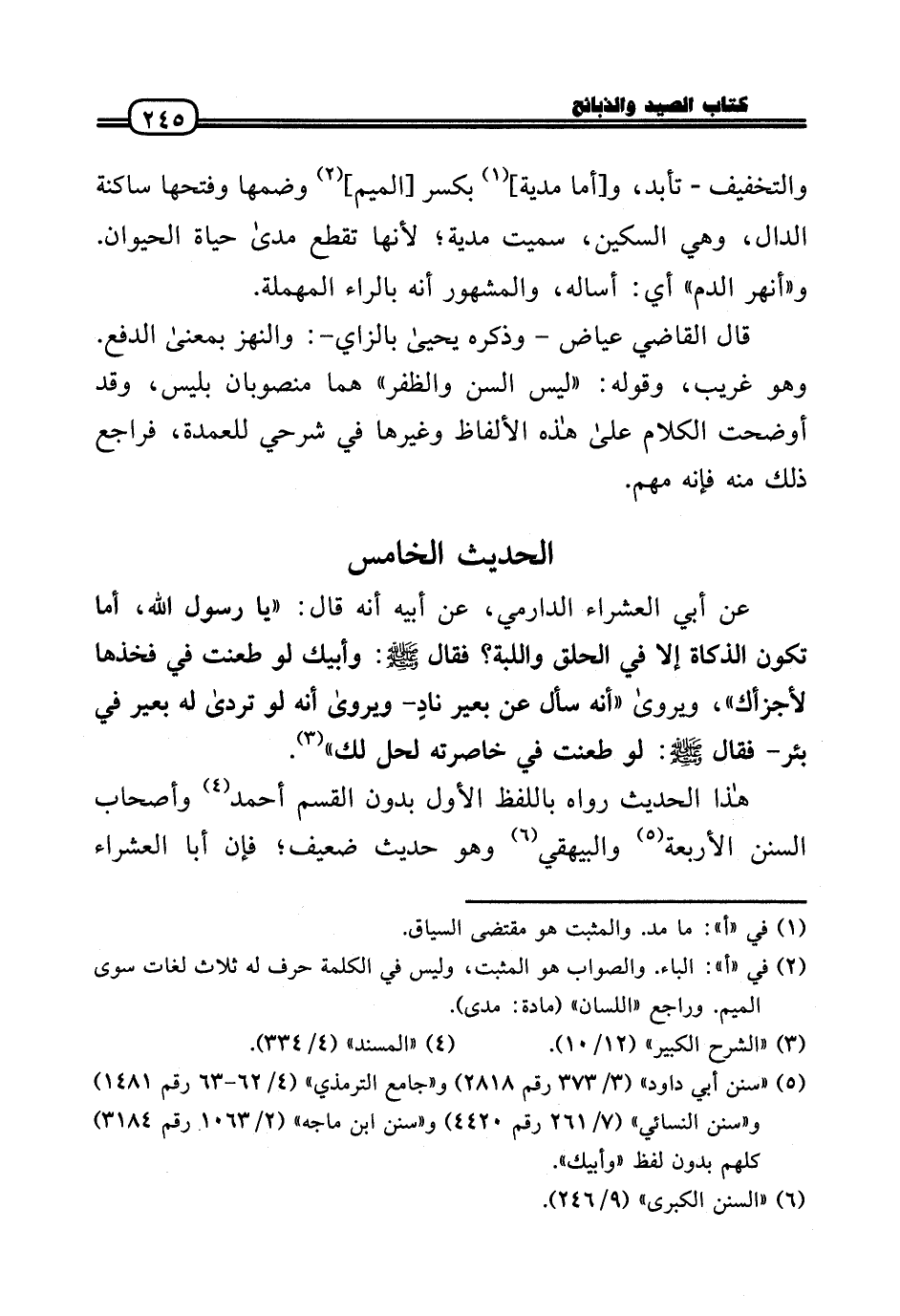 عَن أبي العشراء الدَّارمِيّ، عَن أَبِيه أَنه قَالَ: «يَا رَسُول الله، أما تكون الذَّكَاة إِلَّا فِي الْحلق واللبة؟ فَقَالَ (: وَأَبِيك لَو طعنت فِي فَخذهَا لأجزأك» ، وَيروَى «أَنه سَأَلَ عَن بعير نادٍ - وَيروَى أَنه لَو تردى لَهُ بعير فِي بِئْر - فَقَالَ (: لَو طعنت فِي خاصرته لحل لَك» .