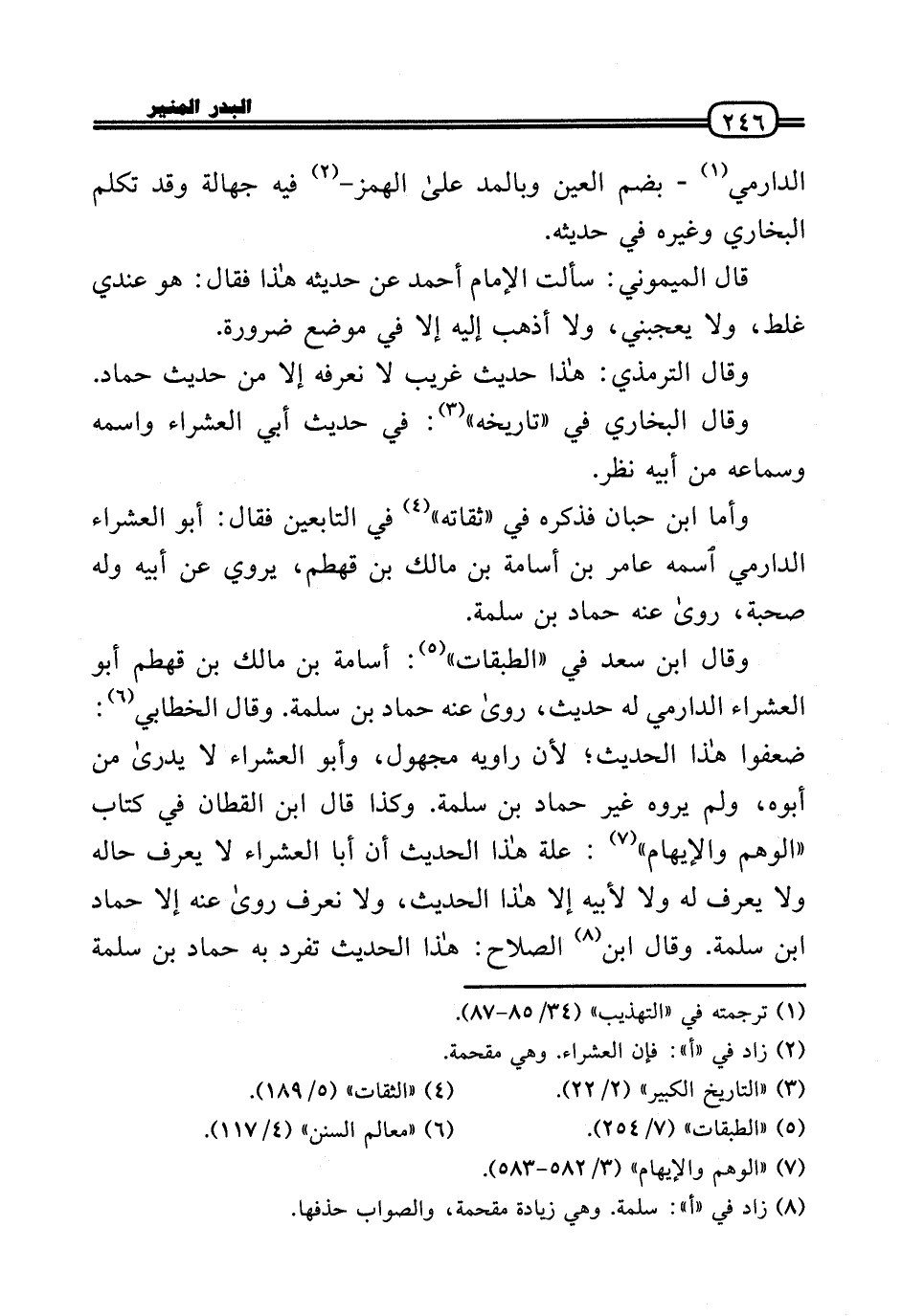 وَقَالَ ابْن سعد فِي «الطَّبَقَات» : أُسَامَة بن مَالك بن قهطم أَبُو العشراء الدَّارمِيّ لَهُ حَدِيث، رَوَى عَنهُ حَمَّاد بن سَلمَة. وَقَالَ الْخطابِيّ: ضعفوا هَذَا الحَدِيث؛ لِأَن رَاوِيه مَجْهُول، وَأَبُو العشراء لَا يُدْرَى من أَبوهُ، وَلم يروه غير حَمَّاد بن سَلمَة. وَكَذَا قَالَ ابْن الْقطَّان فِي كتاب «الْوَهم وَالْإِيهَام» : عِلّة هَذَا الحَدِيث أَن أَبَا العشراء لَا يعرف حَاله وَلَا يعرف لَهُ وَلَا لِأَبِيهِ إِلَّا هَذَا الحَدِيث، وَلَا نَعْرِف رَوَى عَنهُ إِلَّا حَمَّاد بن سَلمَة. وَقَالَ ابْن الصّلاح: هَذَا الحَدِيث تفرد بِهِ حَمَّاد بن سَلمَة
