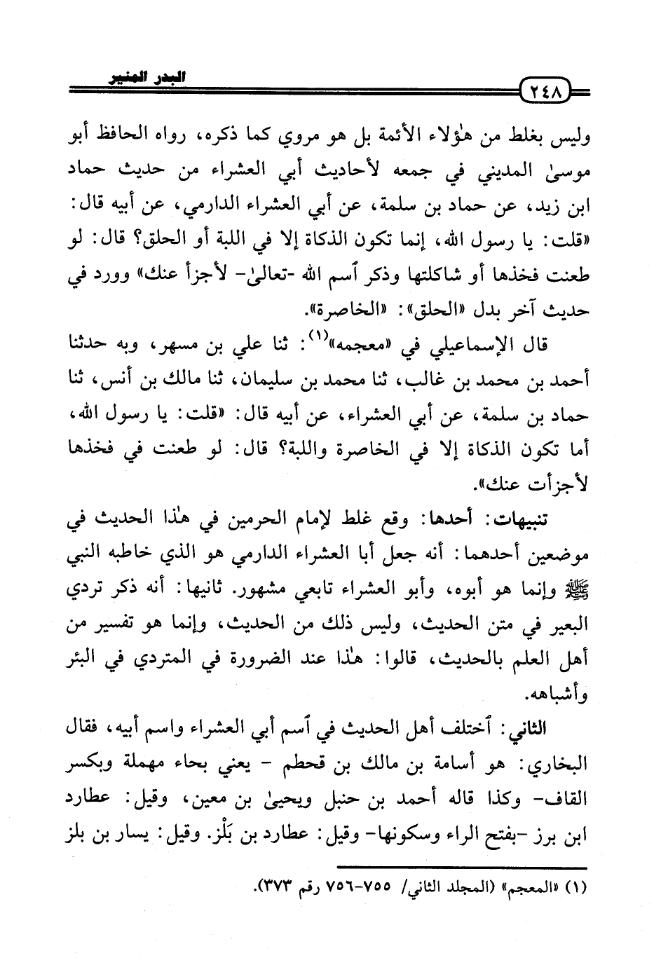 تَنْبِيهَات: أَحدهَا: وَقع غلط لإِمَام الْحَرَمَيْنِ فِي هَذَا الحَدِيث فِي موضِعين أَحدهمَا: أَنه جعل أَبَا العشراء الدَّارمِيّ هُوَ الَّذِي خاطبه النَّبِي - صَلَّى الله عَلَيْهِ وَسلم - وَإِنَّمَا هُوَ أَبوهُ، وَأَبُو العشراء تَابِعِيّ مَشْهُور. ثَانِيهَا: أَنه ذكر تردي الْبَعِير فِي متن الحَدِيث، وَلَيْسَ ذَلِك من الحَدِيث، وَإِنَّمَا هُوَ تَفْسِير من أهل الْعلم بِالْحَدِيثِ، قَالُوا: هَذَا عِنْد الضَّرُورَة فِي المتردي فِي الْبِئْر وأشباهه.