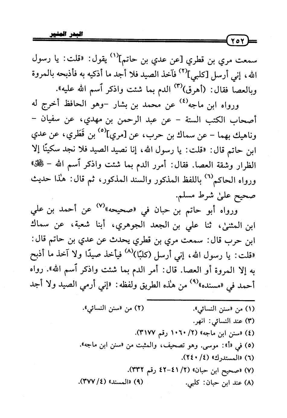 وَرَوَاهُ ابْن مَاجَه عَن مُحَمَّد بن بشار - وَهُوَ الْحَافِظ أخرج لَهُ أَصْحَاب الْكتب السِّتَّة - عَن عبد الرَّحْمَن بن مهْدي، عَن سُفْيَان - وناهيك بهما - عَن سماك بن حَرْب، عَن [مري] بن قَطَري، عَن عدي بن حَاتِم قَالَ: «قلت: يَا رَسُول الله، إِنَّا نصيد الصَّيْد فَلَا نجد سكينًا إِلَّا الظرار وشقة الْعَصَا. فَقَالَ: أمرر الدَّم بِمَا شِئْت وَاذْكُر اسْم الله - عَزَّ وَجَلَّ» وَرَوَاهُ الْحَاكِم بِاللَّفْظِ الْمَذْكُور والسند الْمَذْكُور، ثمَّ قَالَ: هَذَا حَدِيث صَحِيح عَلَى شَرط مُسلم.