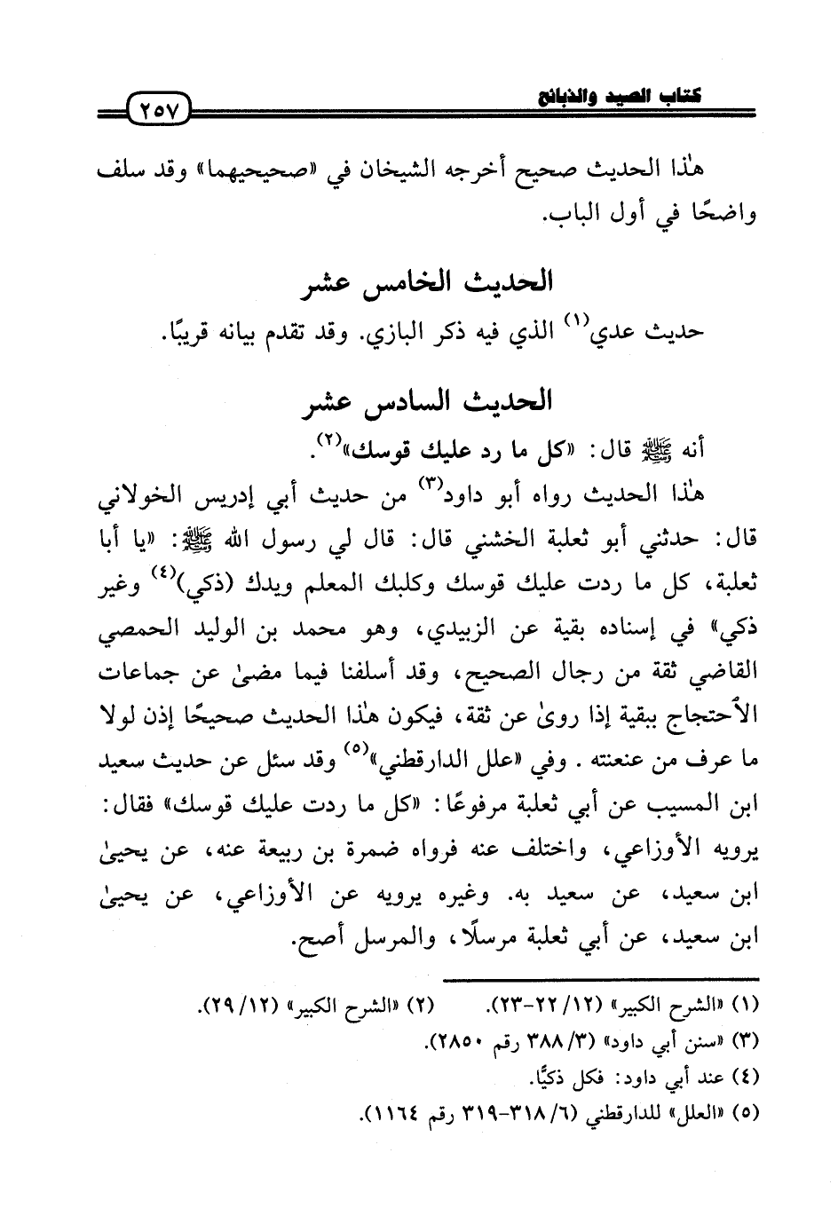 هَذَا الحَدِيث رَوَاهُ أَبُو دَاوُد من حَدِيث أبي إِدْرِيس الْخَولَانِيّ قَالَ: حَدثنِي أَبُو ثَعْلَبَة الْخُشَنِي قَالَ: قَالَ لي رَسُول الله - صَلَّى الله عَلَيْهِ وَسلم -: «يَا أَبَا ثَعْلَبَة، كل مَا ردَّتْ عَلَيْك قوسك وكلبك الْمعلم ويدك (ذكي) وَغير ذكي» فِي إِسْنَاده بَقِيَّة عَن الزبيدِيّ، وَهُوَ مُحَمَّد بن الْوَلِيد الْحِمصِي القَاضِي ثِقَة من رجال الصَّحِيح، وَقد أسلفنا فِيمَا مَضَى عَن جماعات الِاحْتِجَاج بِبَقِيَّة إِذا رَوَى عَن ثِقَة، فَيكون هَذَا الحَدِيث صَحِيحا إِذن لَوْلَا مَا عرف من عنعنته. وَفِي «علل الدَّارَقُطْنِيّ» وَقد سُئِلَ عَن حَدِيث سعيد بن الْمسيب عَن أبي ثَعْلَبَة مَرْفُوعا: «كل مَا ردَّتْ عَلَيْك قوسك» فَقَالَ: يرويهِ الْأَوْزَاعِيّ، وَاخْتلف عَنهُ فَرَوَاهُ ضَمرَة بن ربيعَة عَنهُ، عَن يَحْيَى بن سعيد، عَن سعيد بِهِ. وَغَيره يرويهِ عَن الْأَوْزَاعِيّ، عَن يَحْيَى بن سعيد، عَن أبي ثَعْلَبَة مُرْسلا، والمرسل أصح.
