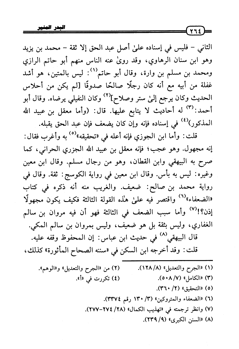 الثَّانِي - فَلَيْسَ فِي إِسْنَاده عَلَى أصل عبد الْحق إِلَّا ثِقَة - مُحَمَّد بن يزِيد وَهُوَ ابْن سِنَان الرهاوي، وَقد رَوَى عَنهُ النَّاس مِنْهُم أَبُو حَاتِم الرَّازِيّ وَمُحَمّد بن مُسلم بن وارة، وَقَالَ أَبُو حَاتِم: لَيْسَ بالمتين، هُوَ أَشد غَفلَة من أَبِيه مَعَ أَنه كَانَ رجلا صَالحا صَدُوقًا [لم يكن من أحلاس الحَدِيث وَكَانَ يرجع إِلَى ستر وَصَلَاح] وَكَانَ النُّفَيْلِي يرضاه. وَقَالَ أَبُو أَحْمد: لَهُ أَحَادِيث لَا يُتَابع عَلَيْهَا. قَالَ: (وَأما معقل بن عبيد الله الْمَذْكُور) فِي إِسْنَاده فَإِنَّهُ وَإِن كَانَ يضعف فَإِن عبد الْحق يقبله.