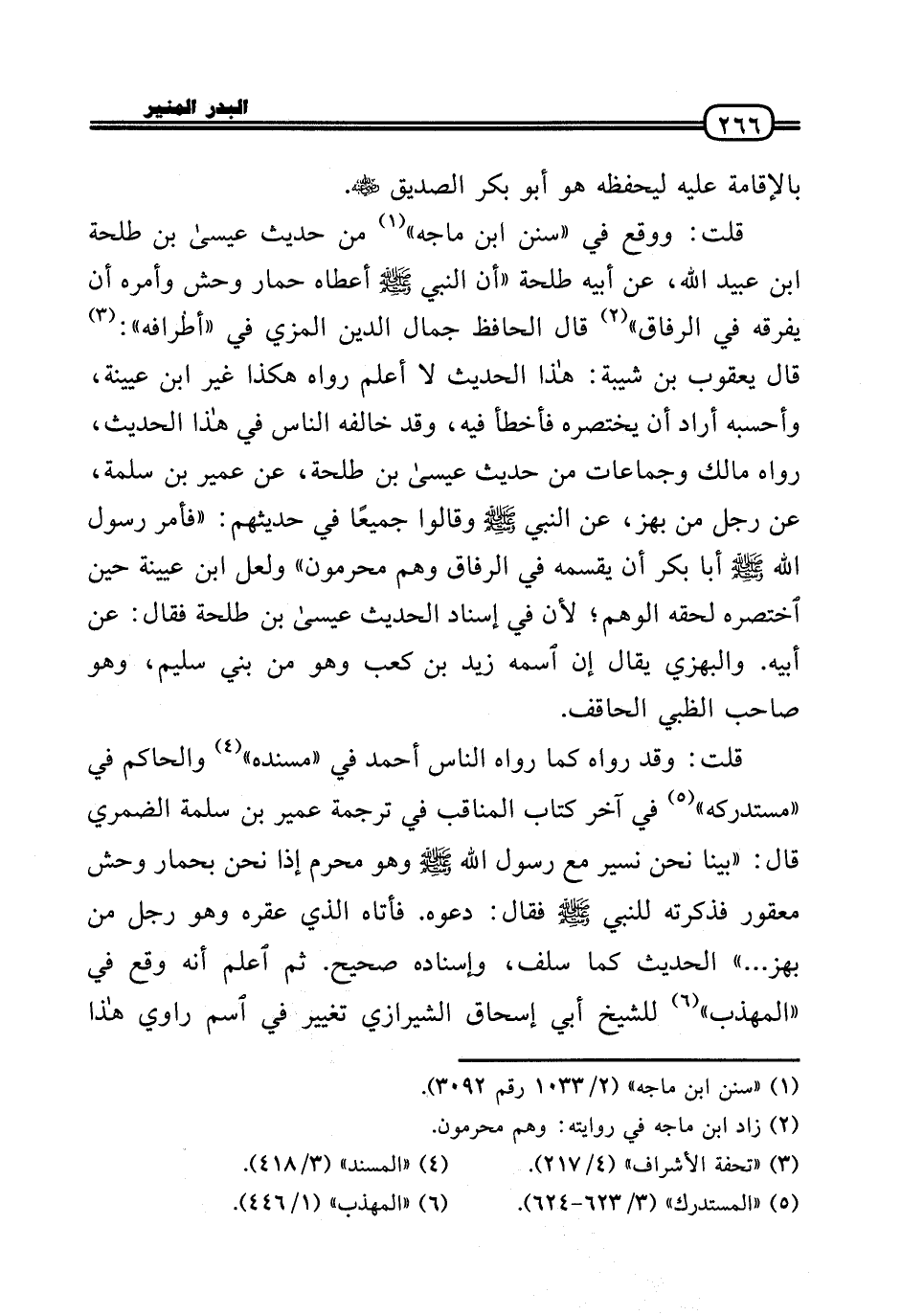 قلت: وَوَقع فِي «سنَن ابْن مَاجَه» من حَدِيث عِيسَى بن طَلْحَة بن عبيد الله، عَن أَبِيه طَلْحَة «أَن النَّبِي - صَلَّى الله عَلَيْهِ وَسلم - أعطَاهُ حمَار وَحش وَأمره أَن يفرقه فِي الرفاق» قَالَ الْحَافِظ جمال الدَّين الْمزي فِي «أَطْرَافه» : قَالَ يَعْقُوب بن شيبَة: هَذَا الحَدِيث لَا أعلم رَوَاهُ هَكَذَا غير ابْن عُيَيْنَة، وَأَحْسبهُ أَرَادَ أَن يختصره فَأَخْطَأَ فِيهِ، وَقد خَالفه النَّاس فِي هَذَا الحَدِيث، رَوَاهُ مَالك وجماعات من حَدِيث عِيسَى بن طَلْحَة، عَن عُمَيْر بن سَلمَة، عَن رجل من بهز، عَن النَّبِي - صَلَّى الله عَلَيْهِ وَسلم - وَقَالُوا جَمِيعًا فِي حَدِيثهمْ: «فَأمر رَسُول الله - صَلَّى الله عَلَيْهِ وَسلم - أَبَا بكر أَن يقسمهُ فِي الرفاق وهم محرمون» وَلَعَلَّ ابْن عُيَيْنَة حِين اخْتَصَرَهُ لحقه الْوَهم؛ لِأَن فِي إِسْنَاد الحَدِيث عِيسَى بن طَلْحَة فَقَالَ: عَن أَبِيه. والبهزي يُقَال إِن اسْمه زيد بن كَعْب وَهُوَ من بني سليم، وَهُوَ صَاحب الظبي الحاقف.