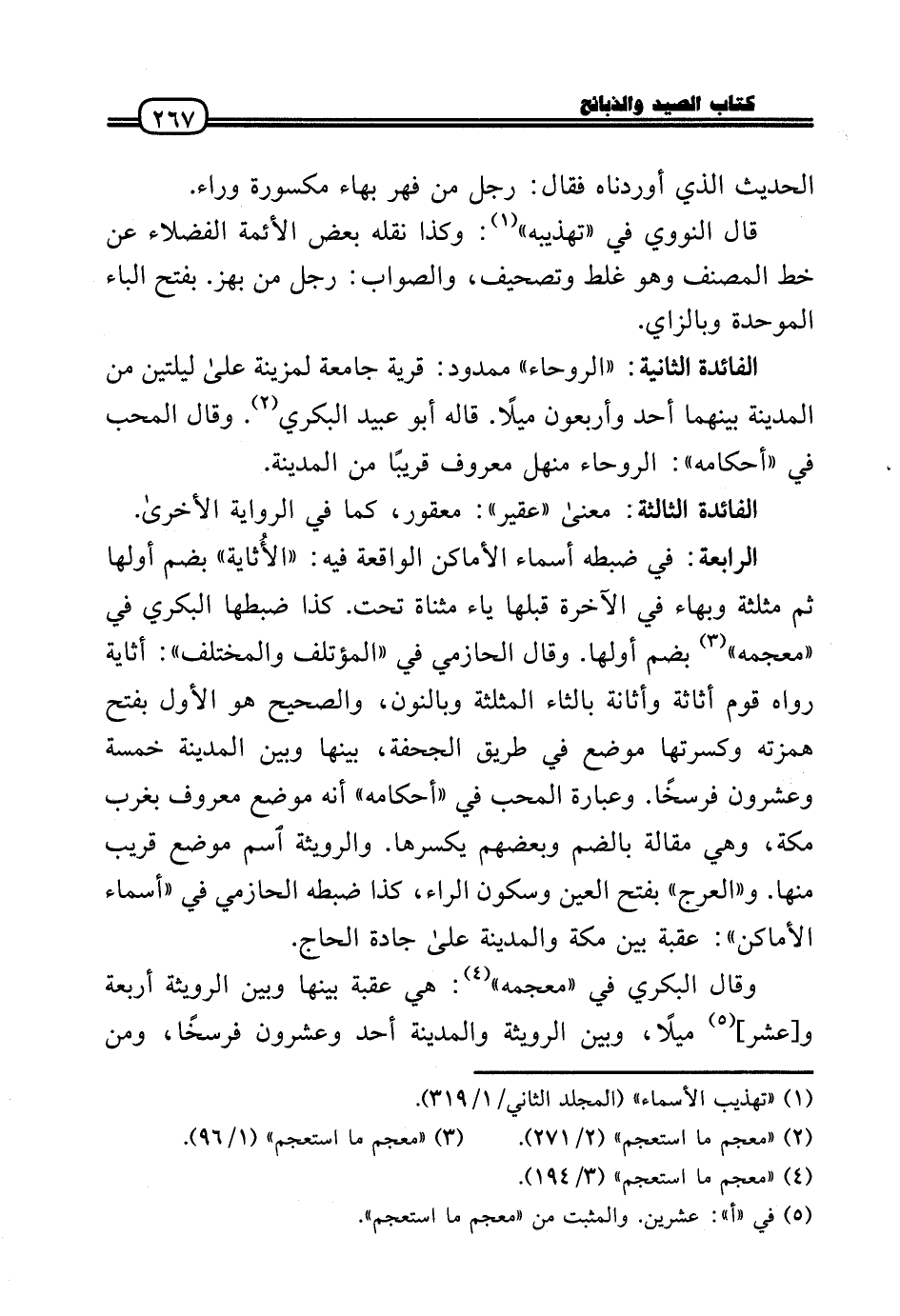 الرَّابِعَة: فِي ضَبطه أَسمَاء الْأَمَاكِن الْوَاقِعَة فِيهِ: «الأُثاية» بِضَم أَولهَا ثمَّ مُثَلّثَة وبهاء فِي الْآخِرَة قبلهَا يَاء مثناة تَحت. كَذَا ضَبطهَا الْبكْرِيّ فِي «مُعْجَمه» بِضَم أَولهَا. وَقَالَ الْحَازِمِي فِي «المؤتلف والمختلف» : أثاية رَوَاهُ قوم أَثَاثَة وأثانة بالثاء الْمُثَلَّثَة وبالنون، وَالصَّحِيح هُوَ الأول بِفَتْح همزته وكسرتها مَوضِع فِي طَرِيق الْجحْفَة، بَينهَا وَبَين الْمَدِينَة خَمْسَة وَعِشْرُونَ فرسخًا. وَعبارَة الْمُحب فِي «أَحْكَامه» أَنه مَوضِع مَعْرُوف بغرب مَكَّة، وَهِي مقَالَة بِالضَّمِّ وَبَعْضهمْ يكسرها. والرويثة اسْم مَوضِع قريب مِنْهَا. و «العرج» بِفَتْح الْعين وَسُكُون الرَّاء، كَذَا ضَبطه الْحَازِمِي فِي «أَسمَاء الْأَمَاكِن» : عقبَة بَين مَكَّة وَالْمَدينَة عَلَى جادة الْحَاج.