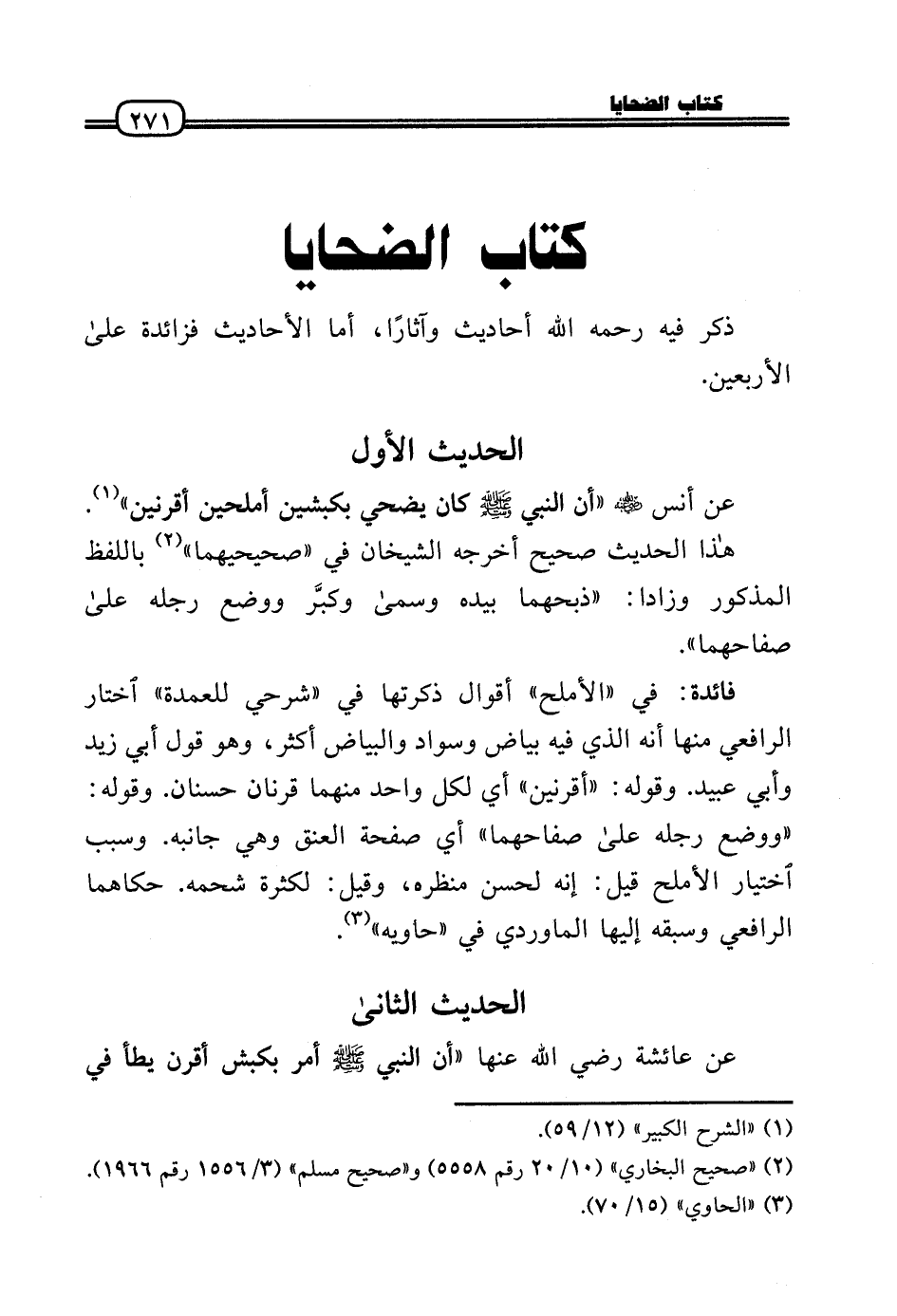 عَن أنس رَضِيَ اللَّهُ عَنْه «أَن النَّبِي - صَلَّى الله عَلَيْهِ وَسلم - كَانَ يُضحي بكبشين أملحين أقرنين» .