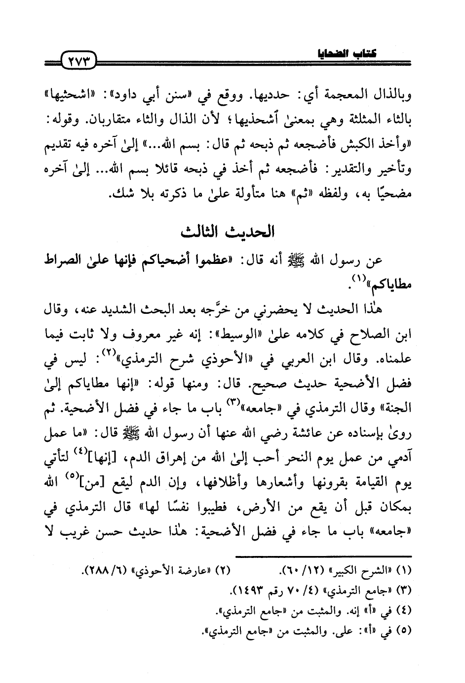 هَذَا الحَدِيث لَا يحضرني من خرَّجه بعد الْبَحْث الشَّديد عَنهُ، وَقَالَ ابْن الصّلاح فِي كَلَامه عَلَى «الْوَسِيط» : إِنَّه غير مَعْرُوف وَلَا ثَابت فِيمَا علمناه. وَقَالَ ابْن الْعَرَبِيّ فِي «الأحوذي شرح التِّرْمِذِيّ» : لَيْسَ فِي فضل الْأُضْحِية حَدِيث صَحِيح. قَالَ: وَمِنْهَا قَوْله: «إِنَّهَا مَطَايَاكُمْ إِلَى الْجنَّة» وَقَالَ التِّرْمِذِيّ فِي «جَامعه» بَاب مَا جَاءَ فِي فضل الْأُضْحِية. ثمَّ رَوَى بِإِسْنَادِهِ عَن عَائِشَة رَضِيَ اللَّهُ عَنْها أَن رَسُول الله - صَلَّى الله عَلَيْهِ وَسلم - قَالَ: «مَا عمل آدَمِيّ من عمل يَوْم النَّحْر أحب إِلَى الله من إهراق الدَّم، [إِنَّهَا] لتأتي يَوْم الْقِيَامَة بقرونها وَأَشْعَارهَا وأظلافها، وَإِن الدَّم ليَقَع [من] الله بمَكَان قبل أَن يَقع من الأَرْض، فطيبوا نفسا لَهَا» قَالَ التِّرْمِذِيّ فِي «جَامعه» بَاب مَا جَاءَ فِي فضل الْأُضْحِية: هَذَا حَدِيث حسن غَرِيب لَا
