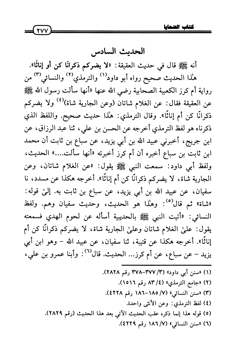 هَذَا الحَدِيث صَحِيح رَوَاهُ أَبُو دَاوُد وَالتِّرْمِذِيّ وَالنَّسَائِيّ من رِوَايَة أم كرز الْكَعْبِيَّة الصحابية رَضِيَ اللَّهُ عَنْها «أَنَّهَا سَأَلت رَسُول الله - صَلَّى الله عَلَيْهِ وَسلم - عَن الْعَقِيقَة فَقَالَ: عَن الْغُلَام شَاتَان (وَعَن الْجَارِيَة شَاة) وَلَا يضركم ذكرانًا كن أم إِنَاثًا» . وَقَالَ التِّرْمِذِيّ: هَذَا حَدِيث صَحِيح. وَاللَّفْظ الَّذِي ذَكرْنَاهُ هُوَ لفظ التِّرْمِذِيّ أخرجه عَن الْحسن بن عَلّي، ثَنَا عبد الرَّزَّاق، عَن ابْن جريج، أَخْبرنِي عبيد الله بن أبي يزِيد، عَن سِبَاع بن ثَابت أَن مُحَمَّد بن ثَابت بن سِبَاع أخبرهُ أَن أم كرز أخْبرته «أَنَّهَا سَأَلت ... .» الحَدِيث، وَلَفظ أبي دَاوُد: سَمِعت النَّبِي - صَلَّى الله عَلَيْهِ وَسلم - يَقُول: «عَن الْغُلَام شَاتَان، وَعَن الْجَارِيَة شَاة، لَا يضركم ذكرانًا كن أم إِنَاثًا» . أخرجه هَكَذَا عَن مُسَدّد، نَا سُفْيَان، عَن عبيد الله بن أبي يزِيد، عَن سِبَاع بن ثَابت بِهِ. إِلَى قَوْله: «شَاة» ثمَّ قَالَ: وَهَذَا هُوَ الحَدِيث، وَحَدِيث سُفْيَان وهم. وَلَفظ النَّسَائِيّ: «أتيت النَّبِي - صَلَّى الله عَلَيْهِ وَسلم - بِالْحُدَيْبِية أسأله عَن لُحُوم الْهَدْي فَسَمعته يَقُول: عَلَى الْغُلَام شَاتَان وَعَلَى الْجَارِيَة شَاة، لَا يضركم ذكرانًا كن أم إِنَاثًا» . أخرجه هَكَذَا عَن قُتَيْبَة، ثَنَا سُفْيَان، عَن عبيد الله - وَهُوَ ابْن أبي يزِيد - عَن سِبَاع، عَن أم كرز ... الحَدِيث. قَالَ: وأبنا عَمْرو بن عَلّي،