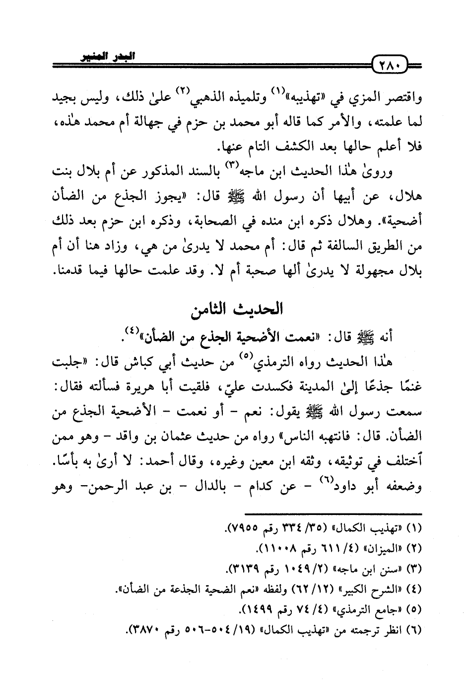 هَذَا الحَدِيث رَوَاهُ التِّرْمِذِيّ من حَدِيث أبي كباش قَالَ: «جلبت غنما جذعًا إِلَى الْمَدِينَة فكسدت عليّ، فَلَقِيت أَبَا هُرَيْرَة فَسَأَلته فَقَالَ: سَمِعت رَسُول الله - صَلَّى الله عَلَيْهِ وَسلم - يَقُول: نعم - أَو نعمت - الْأُضْحِية الْجذع من الضَّأْن. قَالَ: فانتهبه النَّاس» رَوَاهُ من حَدِيث عُثْمَان بن وَاقد - وَهُوَ مِمَّن اخْتلف فِي توثيقه، وَثَّقَهُ ابْن معِين وَغَيره، وَقَالَ أَحْمد: لَا أرَى بِهِ بَأْسا. وَضَعفه أَبُو دَاوُد - عَن كدام - بِالدَّال - بن عبد الرَّحْمَن - وَهُوَ