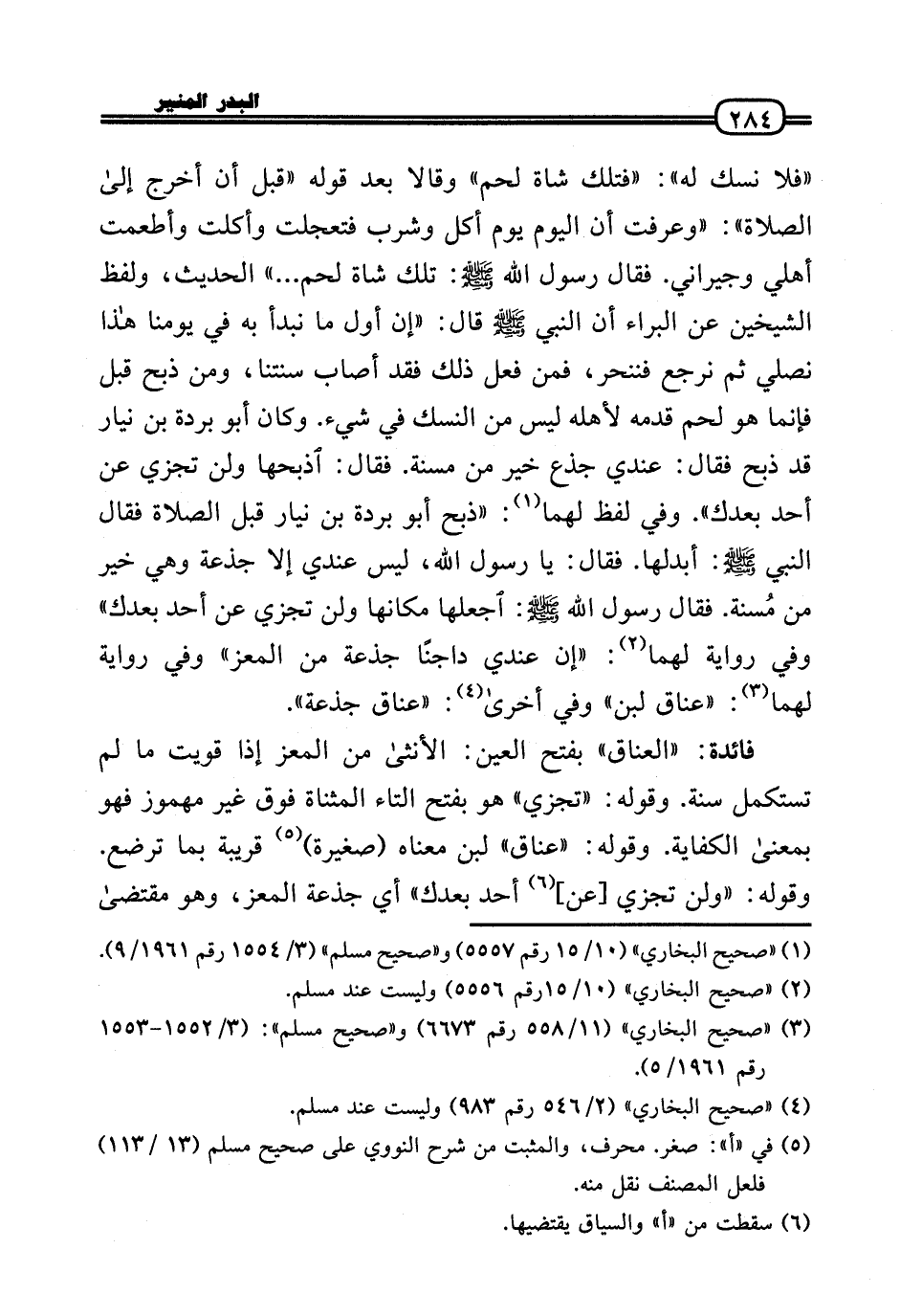 «فَلَا نسك لَهُ» : «فَتلك شَاة لحم» وَقَالا بعد قَوْله «قبل أَن أخرج إِلَى الصَّلَاة» : «وَعرفت أَن الْيَوْم يَوْم أكل وَشرب فتعجلت وأكلت وأطعمت أَهلِي وجيراني. فَقَالَ رَسُول الله - صَلَّى الله عَلَيْهِ وَسلم -: تِلْكَ شَاة لحم ... » الحَدِيث، وَلَفظ الشَّيْخَيْنِ عَن الْبَراء أَن النَّبِي - صَلَّى الله عَلَيْهِ وَسلم - قَالَ: «إِن أول مَا نبدأ بِهِ فِي يَوْمنَا هَذَا نصلي ثمَّ نرْجِع فننحر، فَمن فعل ذَلِك فقد أصَاب سنتنا، وَمن ذبح قبل فَإِنَّمَا هُوَ لحم قدمه لأَهله لَيْسَ من النّسك فِي شَيْء. وَكَانَ أَبُو بردة بن نيار قد ذبح فَقَالَ: عِنْدِي جذع خير من مُسِنَّة. فَقَالَ: اذْبَحْهَا وَلنْ تجزي عَن أحد بعْدك» . وَفِي لفظ لَهما: «ذبح أَبُو بردة بن نيار قبل الصَّلَاة فَقَالَ النَّبِي - صَلَّى الله عَلَيْهِ وَسلم -: أبدلها. فَقَالَ: يَا رَسُول الله، لَيْسَ عِنْدِي إِلَّا جَذَعَة وَهِي خير من مُسنة. فَقَالَ رَسُول الله - صَلَّى الله عَلَيْهِ وَسلم -: اجْعَلْهَا مَكَانهَا وَلنْ تجزي عَن أحد بعْدك» وَفِي رِوَايَة لَهما: «إِن عِنْدِي داجنًا جَذَعَة من الْمعز» وَفِي رِوَايَة لَهما: «عنَاق لبن» وَفِي أُخْرَى: «عنَاق جَذَعَة» .