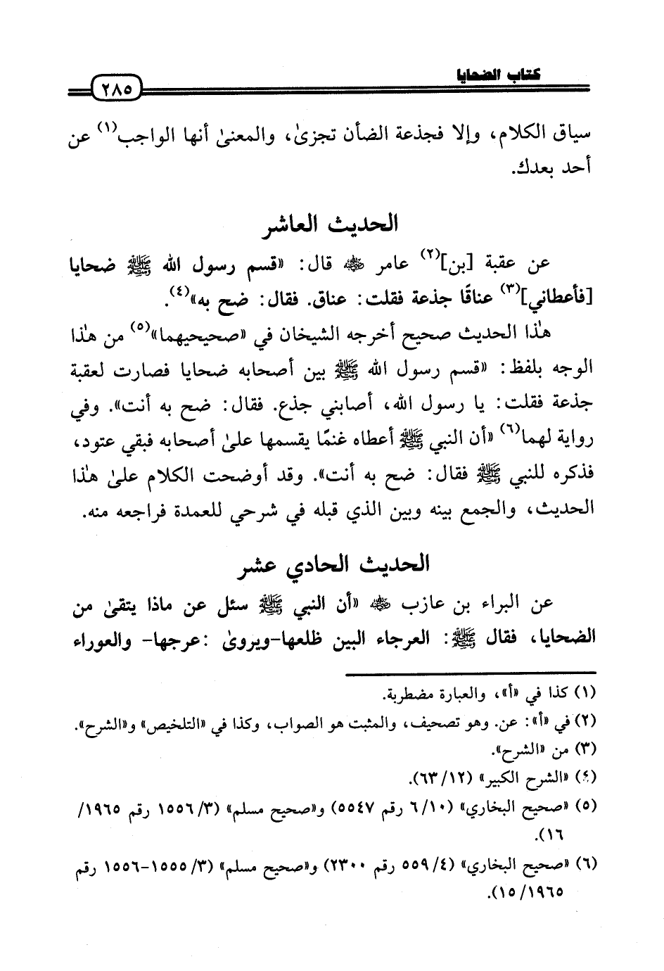 «عَن الْبَراء بن عَازِب رَضِيَ اللَّهُ عَنْه «أَن النَّبِي - صَلَّى الله عَلَيْهِ وَسلم - سُئِلَ عَن مَاذَا يتقَى من الضَّحَايَا، فَقَالَ (: العرجاء الْبَين ظلعها - وَيروَى: عرجها - والعوراء