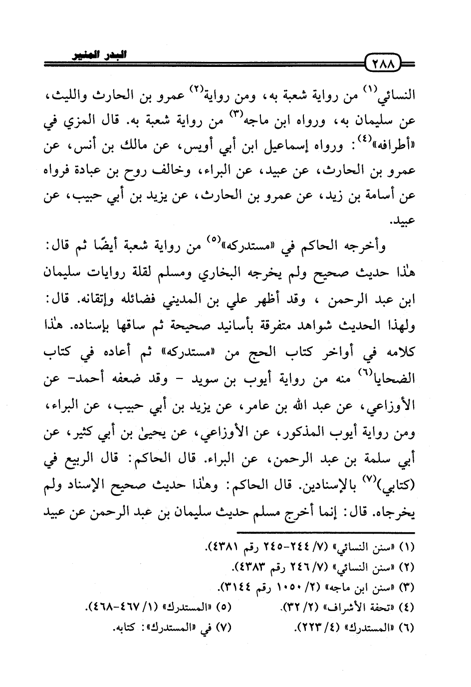 وَأخرجه الْحَاكِم فِي «مُسْتَدْركه» من رِوَايَة شُعْبَة أَيْضا ثمَّ قَالَ: هَذَا حَدِيث صَحِيح وَلم يُخرجهُ البُخَارِيّ وَمُسلم لقلَّة رِوَايَات سُلَيْمَان بن عبد الرَّحْمَن، وَقد أظهر عَلّي بن الْمَدِينِيّ فضائله وإتقانه. قَالَ: وَلِهَذَا الحَدِيث شَوَاهِد مُتَفَرِّقَة بأسانيد صَحِيحَة ثمَّ سَاقهَا بِإِسْنَادِهِ. هَذَا كَلَامه فِي أَوَاخِر كتاب الْحَج من «مُسْتَدْركه» ثمَّ أَعَادَهُ فِي كتاب الضَّحَايَا مِنْهُ من رِوَايَة أَيُّوب بن سُوَيْد - وَقد ضعفه أَحْمد - عَن الْأَوْزَاعِيّ، عَن عبد الله بن عَامر، عَن يزِيد بن أبي حبيب، عَن الْبَراء، وَمن رِوَايَة أَيُّوب الْمَذْكُور، عَن الْأَوْزَاعِيّ، عَن يَحْيَى بن أبي كثير، عَن أبي سَلمَة بن عبد الرَّحْمَن، عَن الْبَراء. قَالَ الْحَاكِم: قَالَ الرّبيع فِي (كتابي) بالإسنادين. قَالَ الْحَاكِم: وَهَذَا حَدِيث صَحِيح الْإِسْنَاد وَلم يخرجَاهُ. قَالَ: إِنَّمَا أخرج مُسلم حَدِيث سُلَيْمَان بن عبد الرَّحْمَن عَن عبيد