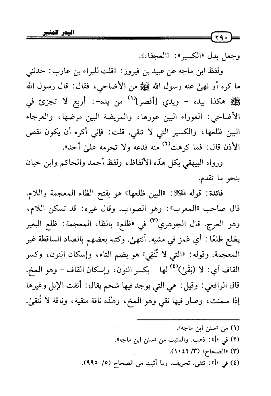 وَلَفظ ابْن مَاجَه عَن عبيد بن فَيْرُوز: «قلت للبراء بن عَازِب: حَدثنِي مَا كره أَو نهَى عَنهُ رَسُول الله - صَلَّى الله عَلَيْهِ وَسلم - من الْأَضَاحِي، فَقَالَ: قَالَ رَسُول الله - صَلَّى الله عَلَيْهِ وَسلم - هَكَذَا بِيَدِهِ - ويدي [أقصر] من يَده -: أَربع لَا تُجزئ فِي الْأَضَاحِي: العوراء الْبَين عورها، والمريضة الْبَين مَرضهَا، والعرجاء الْبَين ظلعها، والكسير الَّتِي لَا تنقي. قلت: فَإِنِّي أكره أَن يكون نقص الْأذن قَالَ: فَمَا كرهت مِنْهُ فَدَعْهُ وَلَا تحرمه عَلَى أحد» .