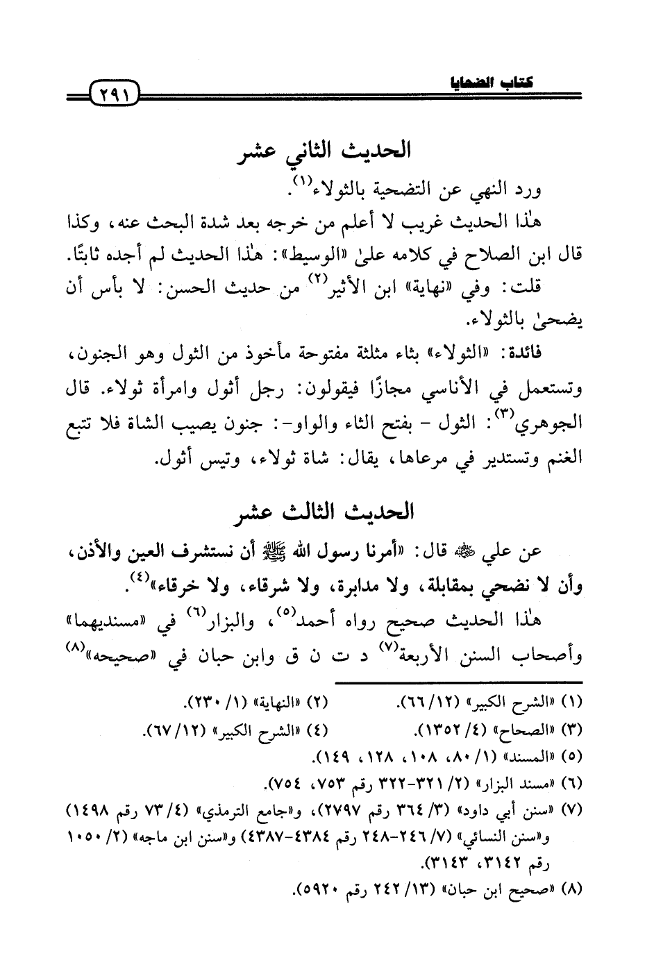 عَن عَلّي رَضِيَ اللَّهُ عَنْه قَالَ: «أمرنَا رَسُول الله - صَلَّى الله عَلَيْهِ وَسلم - أَن نستشرف الْعين وَالْأُذن، وَأَن لَا نضحي بِمُقَابلَة، وَلَا مدابرة، وَلَا شرقاء، وَلَا خرقاء» .
