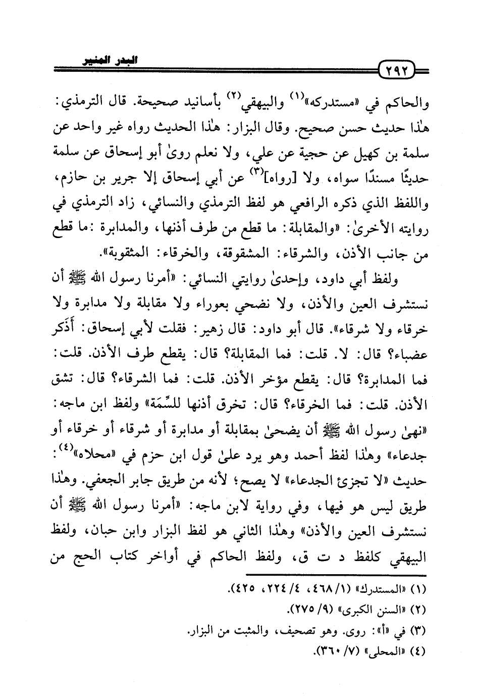 وَالْحَاكِم فِي «مُسْتَدْركه» وَالْبَيْهَقِيّ بأسانيد صَحِيحَة. قَالَ التِّرْمِذِيّ: هَذَا حَدِيث حسن صَحِيح. وَقَالَ الْبَزَّار: هَذَا الحَدِيث رَوَاهُ غير وَاحِد عَن سَلمَة بن كهيل عَن حجية عَن عَلّي، وَلَا نعلم رَوَى أَبُو إِسْحَاق عَن سَلمَة حَدِيثا مُسْندًا سواهُ، وَلَا [رَوَاهُ] عَن أبي إِسْحَاق إِلَّا جرير بن حَازِم، وَاللَّفْظ الَّذِي ذكره الرَّافِعِيّ هُوَ لفظ التِّرْمِذِيّ وَالنَّسَائِيّ، زَاد التِّرْمِذِيّ فِي رِوَايَته الْأُخْرَى: «والمقابلة: مَا قطع من طرف أذنها، والمدابرة: مَا قطع من جَانب الْأذن، والشرقاء: المشقوقة، والخرقاء: المثقوبة» .