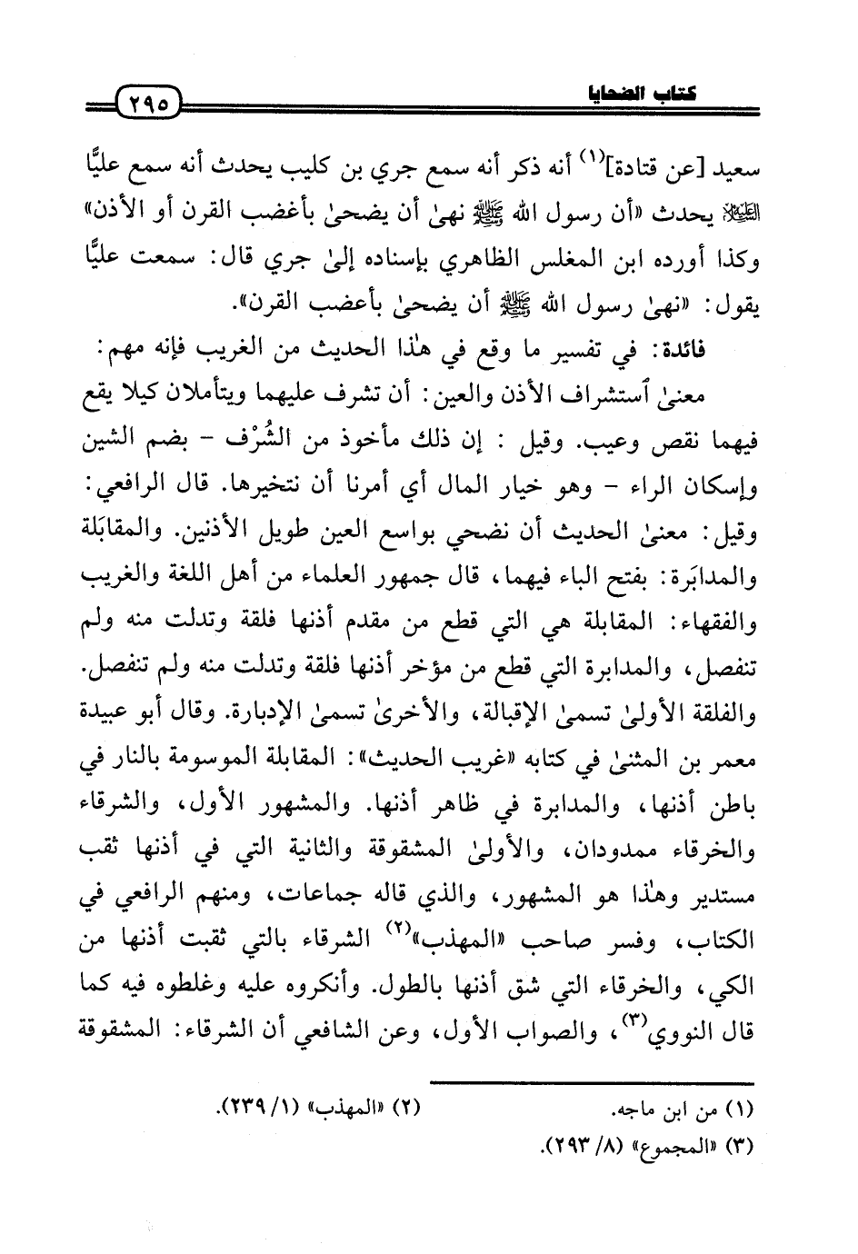 مَعْنَى استشراف الْأذن وَالْعين: أَن تشرف عَلَيْهِمَا ويتأملان كَيْلا يَقع فيهمَا نقص وعيب. وَقيل: إِن ذَلِك مَأْخُوذ من الشُرْف - بِضَم الشين وَإِسْكَان الرَّاء - وَهُوَ خِيَار المَال أَي أمرنَا أَن نتخيرها. قَالَ الرَّافِعِيّ: وَقيل: مَعْنَى الحَدِيث أَن نضحي بواسع الْعين طَوِيل الْأُذُنَيْنِ. والمقابَلة والمدابَرة: بِفَتْح الْبَاء فيهمَا، قَالَ جُمْهُور الْعلمَاء من أهل اللُّغَة والغريب وَالْفُقَهَاء: الْمُقَابلَة هِيَ الَّتِى قطع من مقدم أذنها فلقَة وتدلت مِنْهُ وَلم تنفصل، والمدابرة الَّتِي قطع من مُؤخر أذنها فلقَة وتدلت مِنْهُ وَلم تنفصل. والفلقة الأولَى تسمى الإقبالة، وَالْأُخْرَى تسمى الإدبارة. وَقَالَ أَبُو عُبَيْدَة معمر بن الْمثنى فِي كِتَابه «غَرِيب الحَدِيث» : الْمُقَابلَة الموسومة بالنَّار فِي بَاطِن أذنها، والمدابرة فِي ظَاهر أذنها. وَالْمَشْهُور الأول، والشرقاء والخرقاء ممدودان، وَالْأولَى المشقوقة وَالثَّانيَِة الَّتِي فِي أذنها ثقب مستدير وَهَذَا هُوَ الْمَشْهُور، وَالَّذِي قَالَه جماعات، وَمِنْهُم الرَّافِعِيّ فِي الْكتاب، وَفسّر صَاحب «الْمُهَذّب» الشرقاء بِالَّتِي ثقبت أذنها من الكي، والخرقاء الَّتِي شقّ أذنها بالطول. وأنكروه عَلَيْهِ وغلطوه فِيهِ كَمَا قَالَ النَّوَوِيّ، وَالصَّوَاب الأول، وَعَن الشَّافِعِي أَن الشرقاء: المشقوقة