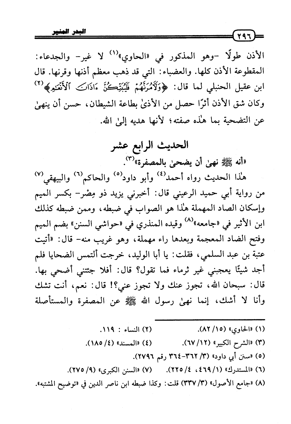 الْأذن طولا - وَهُوَ الْمَذْكُور فِي «الْحَاوِي» لَا غير - والجدعاء: المقطوعة الْأذن كلهَا. والعضباء: الَّتِي قد ذهب مُعظم أذنها وقرنها. قَالَ ابْن عقيل الْحَنْبَلِيّ لما قَالَ: (ولآمرنهم فليبتكن آذان الْأَنْعَام) وَكَانَ شقّ الْأذن أثرا حصل من الْأَذَى بِطَاعَة الشَّيْطَان، حسن أَن ينْهَى عَن التَّضْحِيَة بِمَا هَذِه صفته؛ لِأَنَّهَا هَدْيه إِلَى الله.