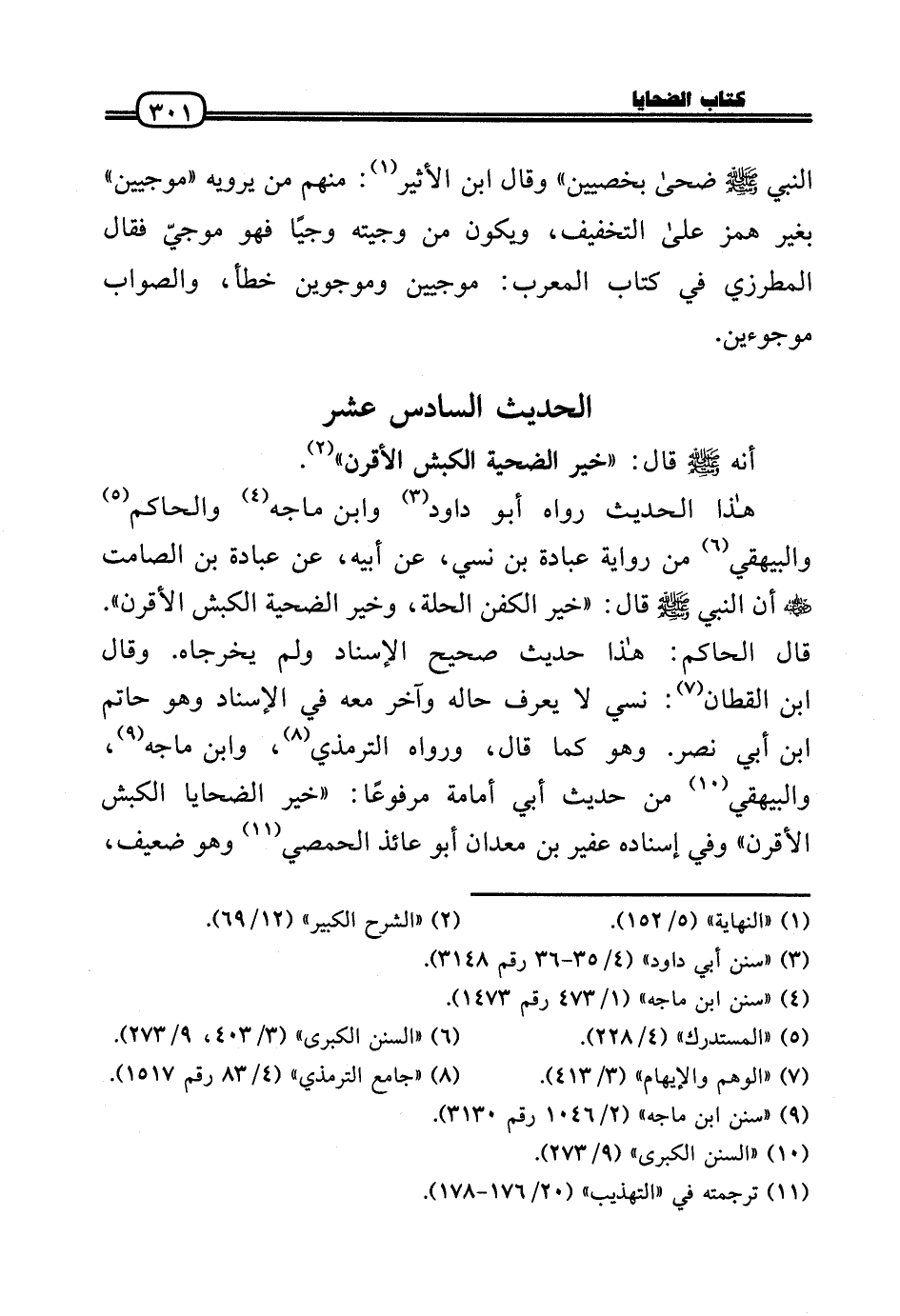 هَذَا الحَدِيث رَوَاهُ أَبُو دَاوُد وَابْن مَاجَه وَالْحَاكِم وَالْبَيْهَقِيّ من رِوَايَة عبَادَة بن نسي، عَن أَبِيه، عَن عبَادَة بن الصَّامِت رَضِيَ اللَّهُ عَنْه أَن النَّبِي - صَلَّى الله عَلَيْهِ وَسلم - قَالَ: «خير الْكَفَن الْحلَّة، وَخير الضحية الْكَبْش الأقرن» . قَالَ الْحَاكِم: هَذَا حَدِيث صَحِيح الْإِسْنَاد وَلم يخرجَاهُ. وَقَالَ ابْن الْقطَّان: نسي لَا يعرف حَاله وَآخر مَعَه فِي الْإِسْنَاد وَهُوَ حَاتِم بن أبي نصر. وَهُوَ كَمَا قَالَ، وَرَوَاهُ التِّرْمِذِيّ، وَابْن مَاجَه، وَالْبَيْهَقِيّ من حَدِيث أبي أُمَامَة مَرْفُوعا: «خير الضَّحَايَا الْكَبْش الأقرن» وَفِي إِسْنَاده عفير بن معدان أَبُو عَائِذ الْحِمصِي وَهُوَ ضَعِيف،