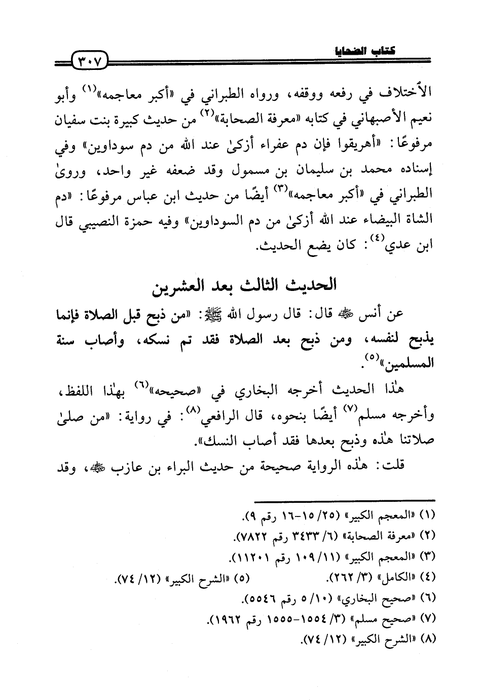 الِاخْتِلَاف فِي رَفعه وَوَقفه، وَرَوَاهُ الطَّبَرَانِيّ فِي «أكبر معاجمه» وَأَبُو نعيم الْأَصْبَهَانِيّ فِي كِتَابه «معرفَة الصَّحَابَة» من حَدِيث كَبِيرَة بنت سُفْيَان مَرْفُوعا: «أهريقوا فَإِن دم عفراء أَزْكَى عِنْد الله من دم سوداوين» وَفِي إِسْنَاده مُحَمَّد بن سُلَيْمَان بن مسمول وَقد ضعفه غير وَاحِد، وَرَوَى الطَّبَرَانِيّ فِي «أكبر معاجمه» أَيْضا من حَدِيث ابْن عَبَّاس مَرْفُوعا: «دم الشَّاة الْبَيْضَاء عِنْد الله أَزْكَى من دم السوداوين» وَفِيه حَمْزَة النصيبي قَالَ ابْن عدي: كَانَ يضع الحَدِيث.