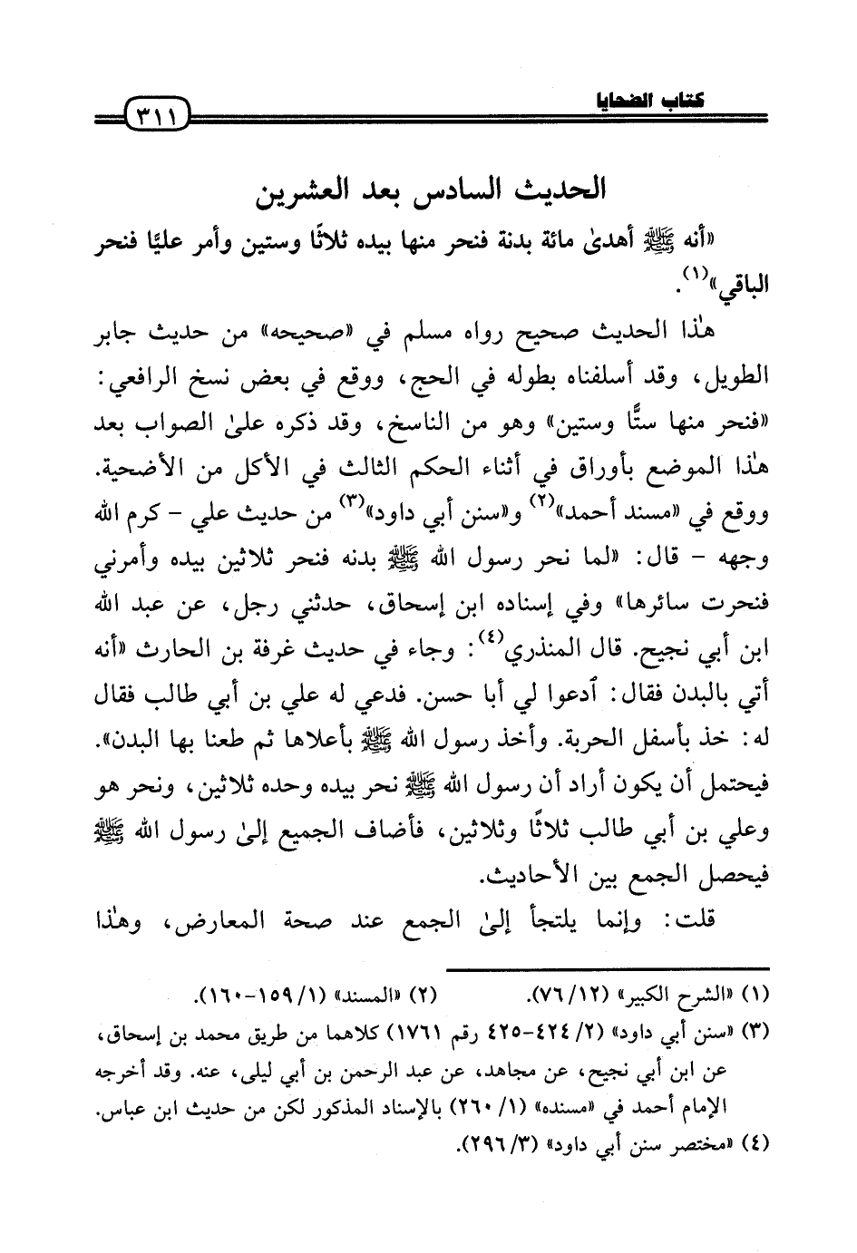 هَذَا الحَدِيث صَحِيح رَوَاهُ مُسلم فِي «صَحِيحه» من حَدِيث جَابر الطَّوِيل، وَقد أسلفناه بِطُولِهِ فِي الْحَج، وَوَقع فِي بعض نسخ الرَّافِعِيّ: «فَنحر مِنْهَا ستًّا وَسِتِّينَ» وَهُوَ من النَّاسِخ، وَقد ذكره عَلَى الصَّوَاب بعد هَذَا الْموضع بأوراق فِي أثْنَاء الحكم الثَّالِث فِي الْأكل من الْأُضْحِية. وَوَقع فِي «مُسْند أَحْمد» و «سنَن أبي دَاوُد» من حَدِيث عَلّي - كرم الله وَجهه - قَالَ: «لما نحر رَسُول الله - صَلَّى الله عَلَيْهِ وَسلم - بدنه فَنحر ثَلَاثِينَ بِيَدِهِ وَأَمرَنِي فنحرت سائرها» وَفِي إِسْنَاده ابْن إِسْحَاق، حَدثنِي رجل، عَن عبد الله بن أبي نجيح. قَالَ الْمُنْذِرِيّ: وَجَاء فِي حَدِيث غرفَة بن الْحَارِث «أَنه أُتِي بِالْبدنِ فَقَالَ: ادعوا لي أَبَا حسن. فدعي لَهُ عَلّي بن أبي طَالب فَقَالَ لَهُ: خُذ بِأَسْفَل الحربة. وَأخذ رَسُول الله - صَلَّى الله عَلَيْهِ وَسلم - بِأَعْلَاهَا ثمَّ طَعنا بهَا الْبدن» . فَيحْتَمل أَن يكون أَرَادَ أَن رَسُول الله - صَلَّى الله عَلَيْهِ وَسلم - نحر بِيَدِهِ وَحده ثَلَاثِينَ، وَنحر هُوَ وَعلي بن أبي طَالب ثَلَاثًا وَثَلَاثِينَ، فأضاف الْجَمِيع إِلَى رَسُول الله - صَلَّى الله عَلَيْهِ وَسلم - فَيحصل الْجمع بَين الْأَحَادِيث.