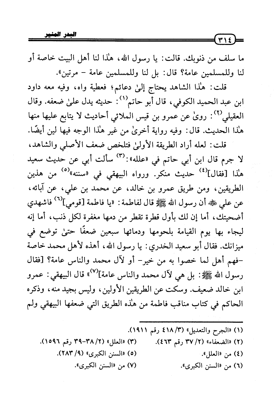 قلت: لَعَلَّه أَرَادَ الطَّرِيقَة الأولَى فتلخص ضعف الْأَصْلِيّ وَالشَّاهِد، لَا جرم قَالَ ابْن أبي حَاتِم فِي «علله» : سَأَلت أبي عَن حَدِيث سعيد هَذَا [فَقَالَ] حَدِيث مُنكر. وَرَوَاهُ الْبَيْهَقِيّ فِي «سنَنه» من هذَيْن الطَّرِيقَيْنِ، وَمن طَرِيق عَمْرو بن خَالِد، عَن مُحَمَّد بن عَلّي، عَن آبَائِهِ، عَن عَلّي رَضِيَ اللَّهُ عَنْه أَن رَسُول الله - صَلَّى الله عَلَيْهِ وَسلم - قَالَ لفاطمة: «يَا فَاطِمَة [قومِي] فاشهدي أضحيتك، أما إِن لَك بِأول قَطْرَة تقطر من دَمهَا مغْفرَة لكل ذَنْب، أما إِنَّه ليجاء بهَا يَوْم الْقِيَامَة بِلُحُومِهَا ودمائها سبعين ضعفا حَتَّى تُوضَع فِي ميزانك. فَقَالَ أَبُو سعيد الْخُدْرِيّ: يَا رَسُول الله، أهذه لأهل مُحَمَّد خَاصَّة - فهم أهل لما خصوا بِهِ من خير - أَو لآل مُحَمَّد وَالنَّاس عَامَّة؟ [فَقَالَ رَسُول الله - صَلَّى الله عَلَيْهِ وَسلم -: بل هِيَ لآل مُحَمَّد وَالنَّاس عَامَّة] » قَالَ الْبَيْهَقِيّ: عَمْرو بن خَالِد ضَعِيف. وَسكت عَن الطَّرِيقَيْنِ الْأَوَّلين، وَلَيْسَ بجيد مِنْهُ، وَذكره الْحَاكِم فِي كتاب مَنَاقِب فَاطِمَة من هَذِه الطَّرِيق الَّتِي ضعفها الْبَيْهَقِيّ وَلم