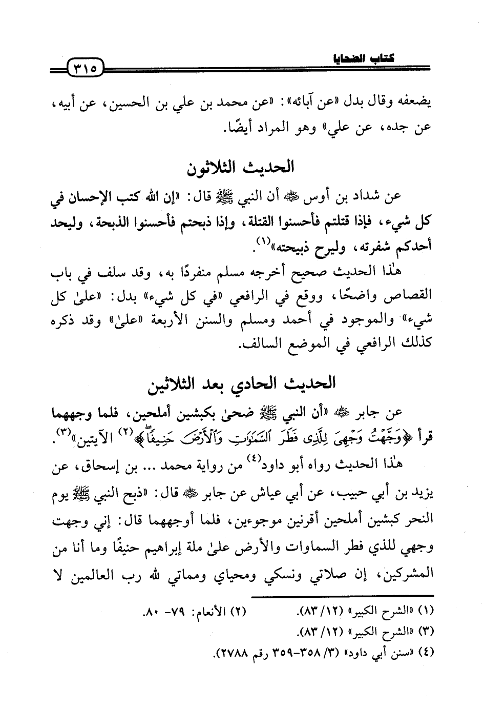 هَذَا الحَدِيث رَوَاهُ أَبُو دَاوُد من رِوَايَة مُحَمَّد ... بن إِسْحَاق، عَن يزِيد بن أبي حبيب، عَن أبي عَيَّاش عَن جَابر رَضِيَ اللَّهُ عَنْه قَالَ: «ذبح النَّبِي - صَلَّى الله عَلَيْهِ وَسلم - يَوْم النَّحْر كبشين أملحين أقرنين موجوءين، فَلَمَّا أوجههمَا قَالَ: إِنِّي وجهت وَجْهي للَّذي فطر السَّمَاوَات وَالْأَرْض عَلَى مِلَّة إِبْرَاهِيم حَنِيفا وَمَا أَنا من الْمُشْركين، إِن صَلَاتي ونسكي ومحياي ومماتي لله رب الْعَالمين لَا