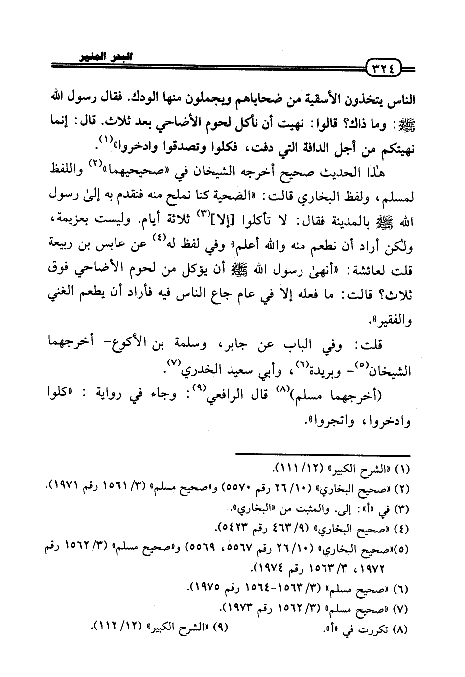 هَذَا الحَدِيث صَحِيح أخرجه الشَّيْخَانِ فِي «صَحِيحَيْهِمَا» وَاللَّفْظ لمُسلم، وَلَفظ البُخَارِيّ قَالَت: «الضحية كُنَّا نملح مِنْهُ فنقدم بِهِ إِلَى رَسُول الله - صَلَّى الله عَلَيْهِ وَسلم - بِالْمَدِينَةِ فَقَالَ: لَا تَأْكُلُوا [إِلَّا] ثَلَاثَة أَيَّام. وَلَيْسَت بعزيمة، وَلَكِن أَرَادَ أَن نطعم مِنْهُ وَالله أعلم» وَفِي لفظ لَهُ عَن عَابس بن ربيعَة قلت لعَائِشَة: «أنهَى رَسُول الله - صَلَّى الله عَلَيْهِ وَسلم - أَن يُؤْكَل من لُحُوم الْأَضَاحِي فَوق ثَلَاث؟ قَالَت: مَا فعله إِلَّا فِي عَام جَاع النَّاس فِيهِ فَأَرَادَ أَن يطعم الْغَنِيّ وَالْفَقِير» .