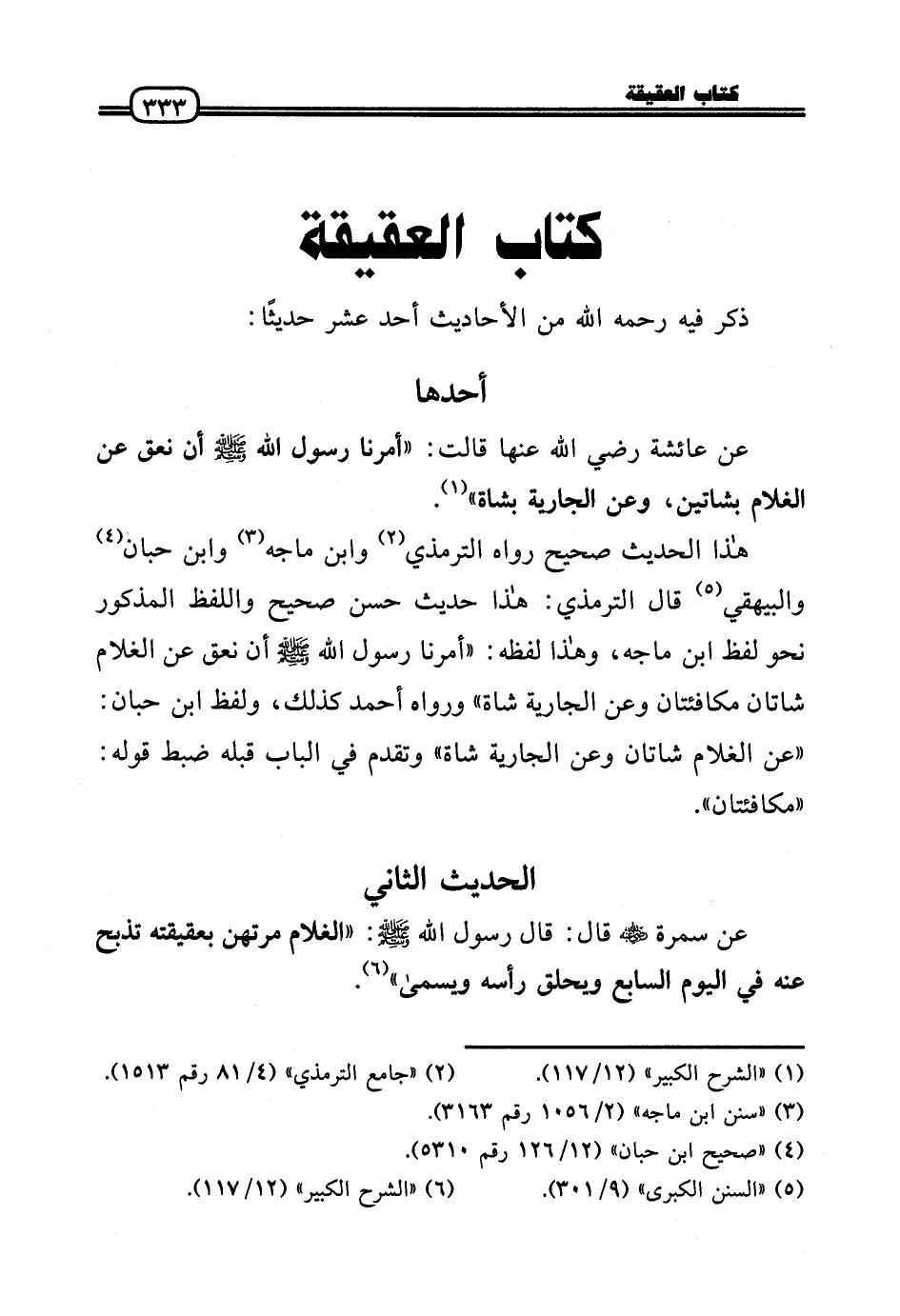 عَن سَمُرَة رَضِيَ اللَّهُ عَنْه قَالَ: قَالَ رَسُول الله - صَلَّى الله عَلَيْهِ وَسلم -: «الْغُلَام مُرْتَهن بعقيقته تذبح عَنهُ فِي الْيَوْم السَّابِع ويحلق رَأسه وَيُسمى» .