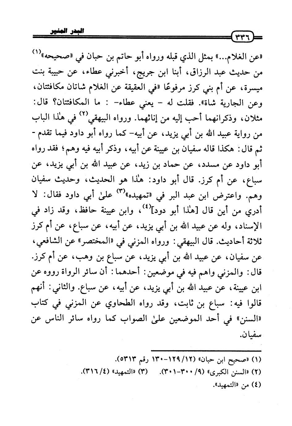 «عَن الْغُلَام ... » بِمثل الَّذِي قبله وَرَوَاهُ أَبُو حَاتِم بن حبَان فِي «صَحِيحه» من حَدِيث عبد الرَّزَّاق، أبنا ابْن جريج، أَخْبرنِي عَطاء، عَن حَبِيبَة بنت ميسرَة، عَن أم بني كرز مَرْفُوعا «فِي الْعَقِيقَة عَن الْغُلَام شَاتَان مكافئتان، وَعَن الْجَارِيَة شَاة» . فَقلت لَهُ - يَعْنِي عَطاء -: مَا المكافئتان؟ قَالَ: مثلان، وذكرانهما أحب إِلَيْهِ من إناثهما. وَرَوَاهُ الْبَيْهَقِيّ فِي هَذَا الْبَاب من رِوَايَة عبيد الله بن أبي يزِيد، عَن أَبِيه - كَمَا رَوَاهُ أَبُو دَاوُد فِيمَا تقدم - ثمَّ قَالَ: هَكَذَا قَالَه سُفْيَان بن عُيَيْنَة عَن أَبِيه، وَذكر أَبِيه فِيهِ وهم؛ فقد رَوَاهُ أَبُو دَاوُد عَن مُسَدّد، عَن حَمَّاد بن زيد، عَن عبيد الله بن أبي يزِيد، عَن سِبَاع، عَن أم كرز. قَالَ أَبُو دَاوُد: هَذَا هُوَ الحَدِيث، وَحَدِيث سُفْيَان وهم. وَاعْترض ابْن عبد الْبر فِي «تمهيده» عَلَى أبي دَاوُد فَقَالَ: لَا أَدْرِي من أَيْن قَالَ [هَذَا أَبُو دود] ، وَابْن عُيَيْنَة حَافظ، وَقد زَاد فِي الْإِسْنَاد، وَله عَن عبيد الله بن أبي يزِيد، عَن أَبِيه، عَن سِبَاع، عَن أم كرز ثَلَاثَة أَحَادِيث. قَالَ الْبَيْهَقِيّ: وَرَوَاهُ الْمُزنِيّ فِي «الْمُخْتَصر» عَن الشَّافِعِي، عَن سُفْيَان، عَن عبيد الله بن أبي يزِيد، عَن سِبَاع بن وهب، عَن أم كرز. قَالَ: والمزني واهم فِيهِ فِي موضِعين: أَحدهمَا: أَن سَائِر الروَاة رَوَوْهُ عَن ابْن عُيَيْنَة، عَن عبيد الله بن أبي يزِيد، عَن أَبِيه، عَن سِبَاع. وَالثَّانِي: أَنهم قَالُوا فِيهِ: سِبَاع بن ثَابت، وَقد رَوَاهُ الطَّحَاوِيّ عَن الْمُزنِيّ فِي كتاب «السّنَن» فِي أحد الْمَوْضِعَيْنِ عَلَى الصَّوَاب كَمَا رَوَاهُ سَائِر النَّاس عَن سُفْيَان.