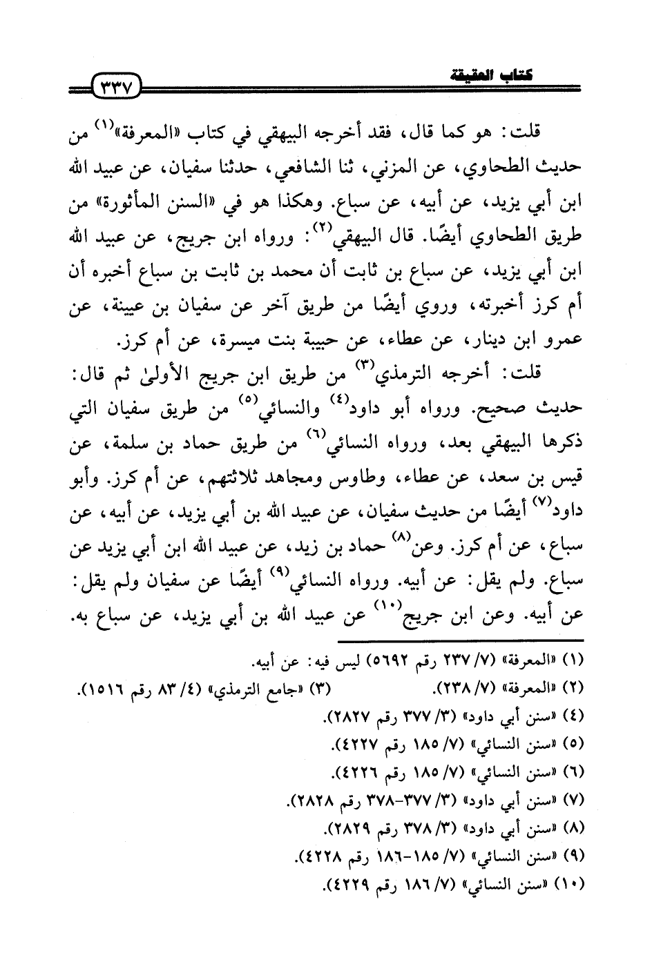 قلت: أخرجه التِّرْمِذِيّ من طَرِيق ابْن جريج الأولَى ثمَّ قَالَ: حَدِيث صَحِيح. وَرَوَاهُ أَبُو دَاوُد وَالنَّسَائِيّ من طَرِيق سُفْيَان الَّتِي ذكرهَا الْبَيْهَقِيّ بعد، وَرَوَاهُ النَّسَائِيّ من طَرِيق حَمَّاد بن سَلمَة، عَن قيس بن سعد، عَن عَطاء، وَطَاوُس وَمُجاهد ثَلَاثَتهمْ، عَن أم كرز. وَأَبُو دَاوُد أَيْضا من حَدِيث سُفْيَان، عَن عبيد الله بن أبي يزِيد، عَن أَبِيه، عَن سِبَاع، عَن أم كرز. وَعَن حَمَّاد بن زيد، عَن عبيد الله ابْن أبي يزِيد عَن سِبَاع. وَلم يقل: عَن أَبِيه. وَرَوَاهُ النَّسَائِيّ أَيْضا عَن سُفْيَان وَلم يقل: عَن أَبِيه. وَعَن ابْن جريج عَن عبيد الله بن أبي يزِيد، عَن سِبَاع بِهِ.