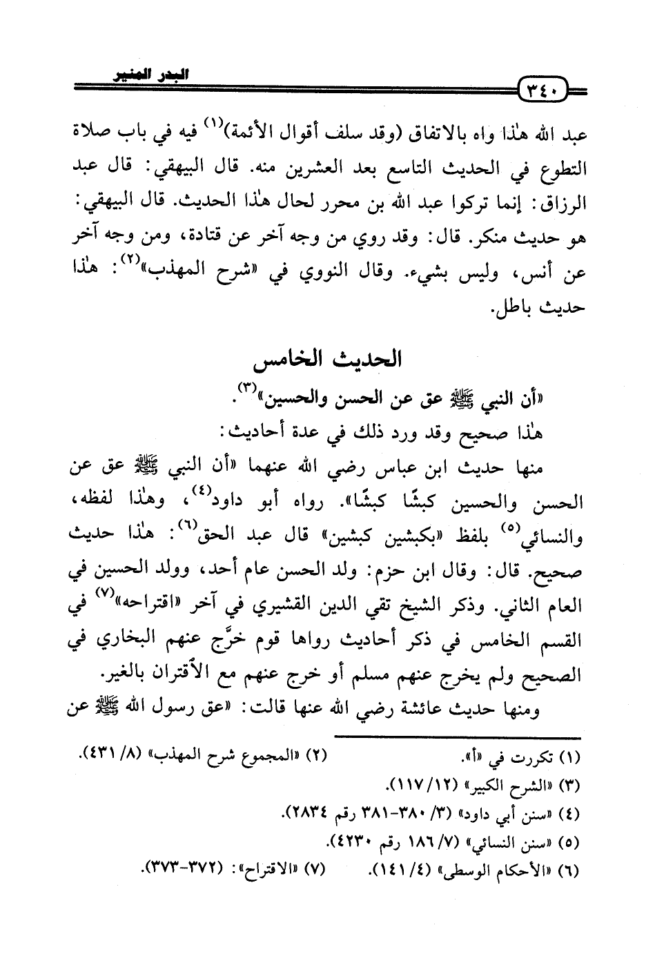 مِنْهَا حَدِيث ابْن عَبَّاس رَضِيَ اللَّهُ عَنْهما «أَن النَّبِي - صَلَّى الله عَلَيْهِ وَسلم - عق عَن الْحسن وَالْحُسَيْن كَبْشًا كَبْشًا» . رَوَاهُ أَبُو دَاوُد، وَهَذَا لَفظه، وَالنَّسَائِيّ بِلَفْظ «بكبشين كبشين» قَالَ عبد الْحق: هَذَا حَدِيث صَحِيح. قَالَ: وَقَالَ ابْن حزم: ولد الْحسن عَام أحد، وَولد الْحُسَيْن فِي الْعَام الثَّانِي. وَذكر الشَّيْخ تَقِيّ الدَّين الْقشيرِي فِي آخر «اقتراحه» فِي الْقسم الْخَامِس فِي ذكر أَحَادِيث رَوَاهَا قوم خرَّج عَنْهُم البُخَارِيّ فِي الصَّحِيح وَلم يخرج عَنْهُم مُسلم أَو خرج عَنْهُم مَعَ الاقتران بِالْغَيْر.