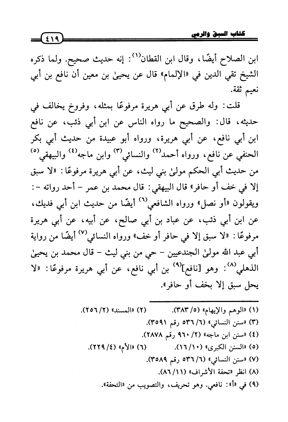 قلت: وَله طرق عَن أبي هُرَيْرَة مَرْفُوعا بِمثلِهِ، وفروخ يُخَالف فِي حَدِيثه، قَالَ: وَالصَّحِيح مَا رَوَاهُ النَّاس عَن ابْن أبي ذِئْب، عَن نَافِع بن أبي نَافِع، عَن أبي هُرَيْرَة، وَرَوَاهُ أَبُو عُبَيْدَة من حَدِيث أبي بكر الْحَنَفِيّ عَن نَافِع، وَرَوَاهُ أَحْمد وَالنَّسَائِيّ وَابْن مَاجَه وَالْبَيْهَقِيّ من حَدِيث أبي الحكم مولَى بني لَيْث، عَن أبي هُرَيْرَة مَرْفُوعا: «لَا سبق إِلَّا فِي خف أَو حافر» قَالَ الْبَيْهَقِيّ: قَالَ مُحَمَّد بن عمر - أحد رُوَاته -: وَيَقُولُونَ «أَو نصل» وَرَوَاهُ الشَّافِعِي أَيْضا من حَدِيث ابْن أبي فديك، عَن ابْن أبي ذِئْب، عَن عباد بن أبي صَالح، عَن أَبِيه، عَن أبي هُرَيْرَة مَرْفُوعا: «لَا سبق إِلَّا فِي حافر أَو خف» وَرَوَاهُ النَّسَائِيّ أَيْضا من رِوَايَة أبي عبد الله مولَى الجندعيين - حَيّ من بني لَيْث - قَالَ مُحَمَّد بن يَحْيَى الذهلي: وَهُوَ [نَافِع] بن أبي نَافِع، عَن أبي هُرَيْرَة مَرْفُوعا: «لَا يحل سبق إِلَّا بخف أَو حافر» .