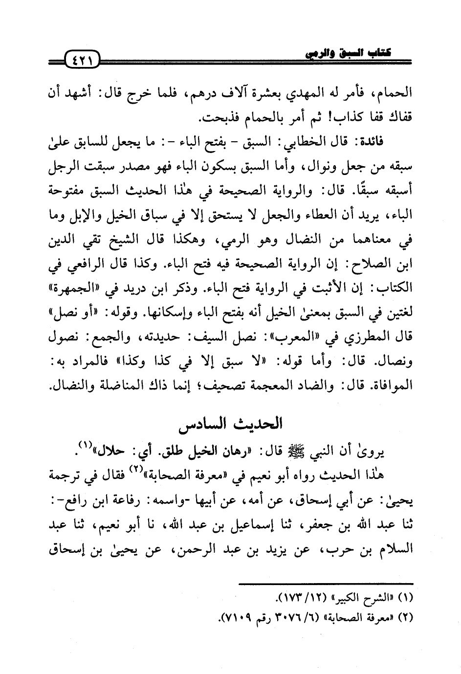 فَائِدَة: قَالَ الْخطابِيّ: السَّبق - بِفَتْح الْبَاء -: مَا يَجْعَل للسابق عَلَى سبقه من جعل ونوال، وَأما السَّبق بِسُكُون الْبَاء فَهُوَ مصدر سبقت الرجل أسبقه سبقًا. قَالَ: وَالرِّوَايَة الصَّحِيحَة فِي هَذَا الحَدِيث السَّبق مَفْتُوحَة الْبَاء، يُرِيد أَن الْعَطاء والجعل لَا يسْتَحق إِلَّا فِي سباق الْخَيل وَالْإِبِل وَمَا فِي مَعْنَاهُمَا من النضال وَهُوَ الرَّمْي، وَهَكَذَا قَالَ الشَّيْخ تَقِيّ الدَّين بن الصّلاح: إِن الرِّوَايَة الصَّحِيحَة فِيهِ فتح الْبَاء. وَكَذَا قَالَ الرَّافِعِيّ فِي الْكتاب: إِن الأثبت فِي الرِّوَايَة فتح الْبَاء. وَذكر ابْن دُرَيْد فِي «الجمهرة» لغتين فِي السَّبق بِمَعْنى الْخَيل أَنه بِفَتْح الْبَاء وإسكانها. وَقَوله: «أَو نصل» قَالَ المطرزي فِي «المعرب» : نصل السَّيْف: حديدته، وَالْجمع: نصول ونصال. قَالَ: وَأما قَوْله: «لَا سبق إِلَّا فِي كَذَا وَكَذَا» فَالْمُرَاد بِهِ: الموافاة. قَالَ: وَالضَّاد الْمُعْجَمَة تَصْحِيف؛ إِنَّمَا ذَاك المناضلة والنضال.