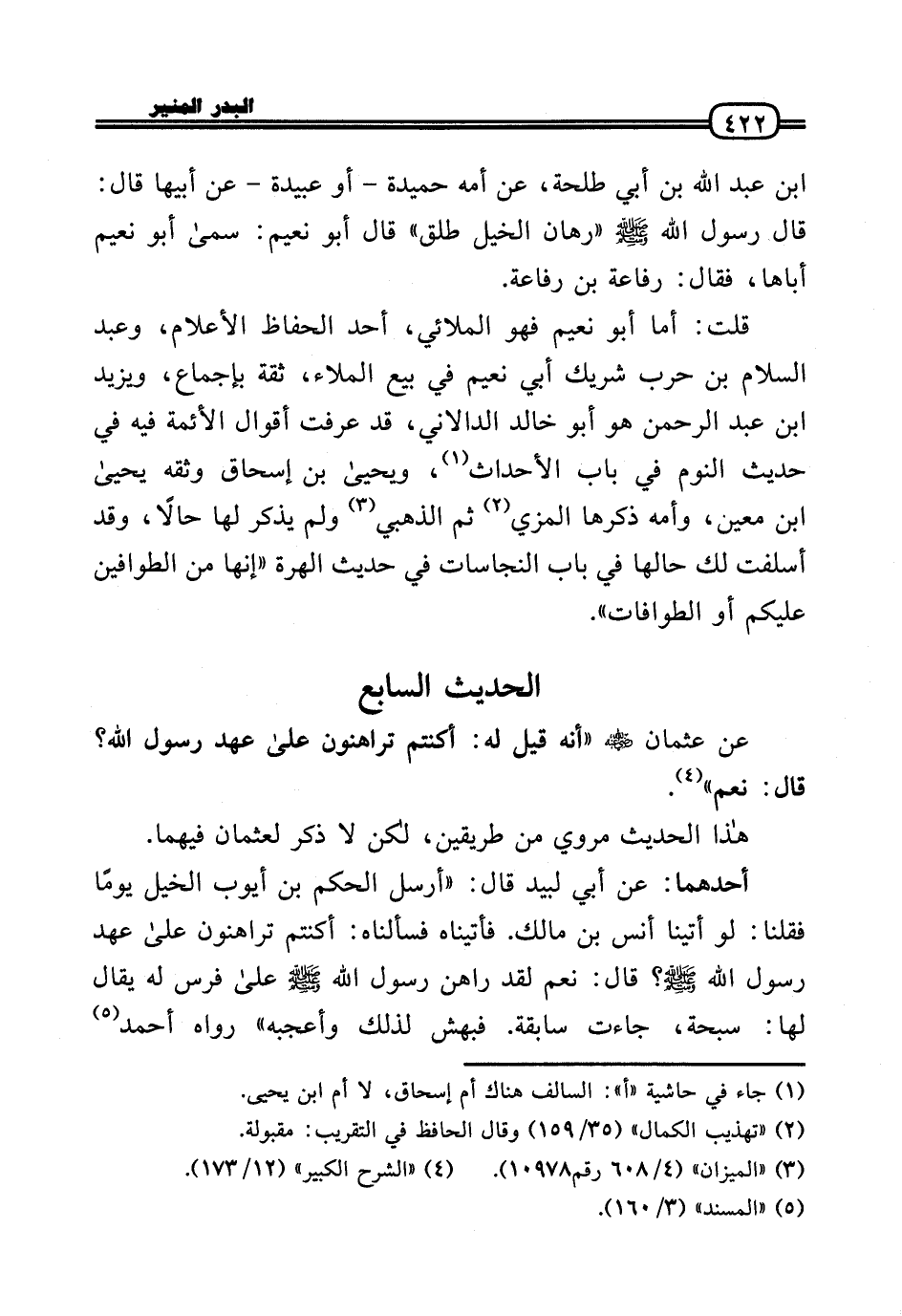 بن عبد الله بن أبي طَلْحَة، عَن أمه حميدة - أَو عُبَيْدَة - عَن أَبِيهَا قَالَ: قَالَ رَسُول الله - صَلَّى الله عَلَيْهِ وَسلم - «رهان الْخَيل طلق» قَالَ أَبُو نعيم: سَمّى أَبُو نعيم أَبَاهَا، فَقَالَ: رِفَاعَة بن رِفَاعَة.