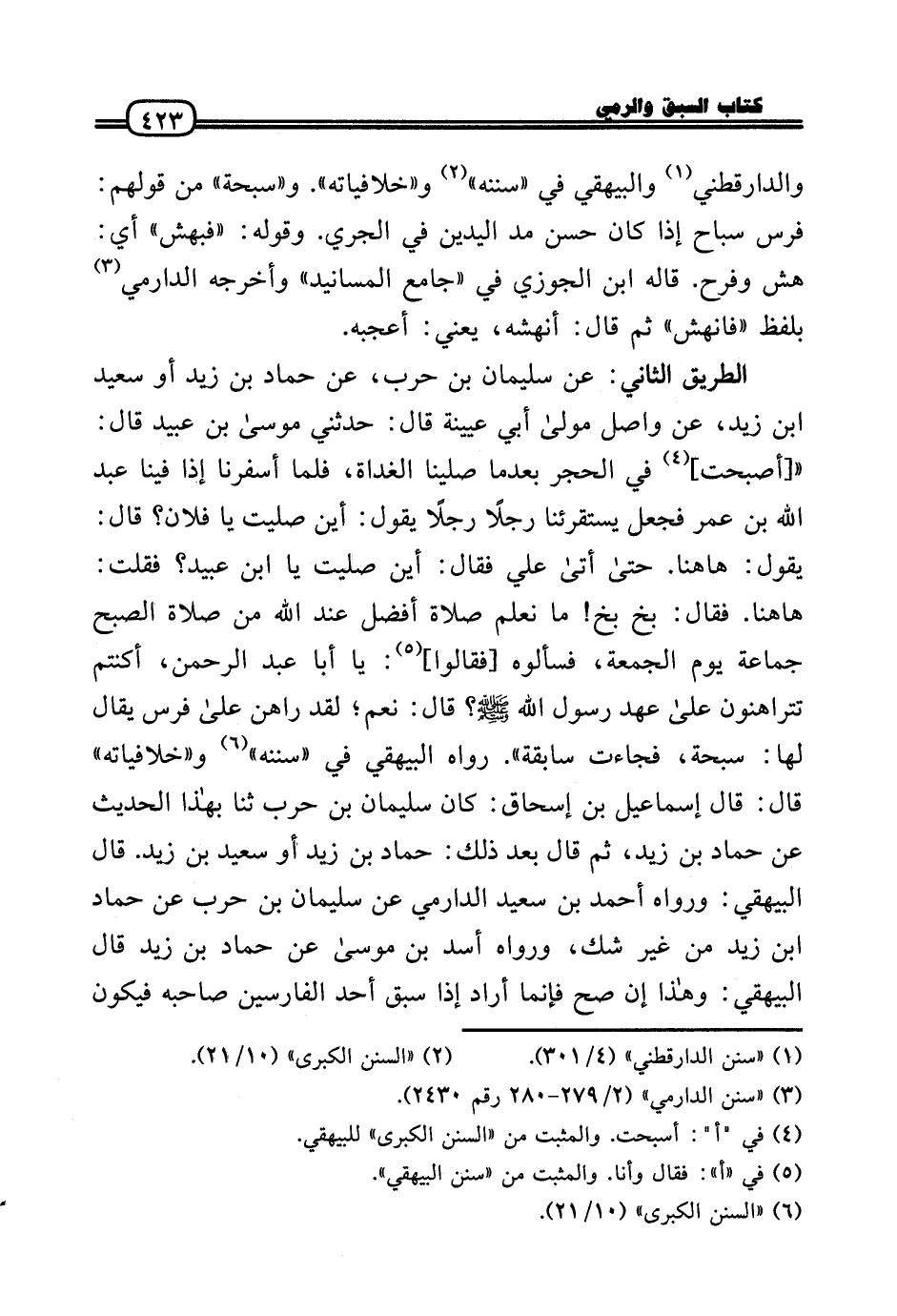 الطَّرِيق الثَّانِي: عَن سُلَيْمَان بن حَرْب، عَن حَمَّاد بن زيد أَو سعيد بن زيد، عَن وَاصل مولَى أبي عُيَيْنَة قَالَ: حَدثنِي مُوسَى بن عبيد قَالَ: « [أَصبَحت] فِي الْحجر بَعْدَمَا صلينَا الْغَدَاة، فَلَمَّا أسفرنا إِذا فِينَا عبد الله بن عمر فَجعل يستقرئنا رجلا رجلا يَقُول: أَيْن صليت يَا فلَان؟ قَالَ: يَقُول: هَاهُنَا. حَتَّى أَتَى عَلّي فَقَالَ: أَيْن صليت يَا ابْن عبيد؟ فَقلت: هَاهُنَا. فَقَالَ: بخ بخ! مَا نعلم صَلَاة أفضل عِنْد الله من صَلَاة الصُّبْح جمَاعَة يَوْم الْجُمُعَة، فَسَأَلُوهُ [فَقَالُوا] : يَا أَبَا عبد الرَّحْمَن، أَكُنْتُم تتراهنون عَلَى عهد رَسُول الله - صَلَّى الله عَلَيْهِ وَسلم -؟ قَالَ: نعم؛ لقد رَاهن عَلَى فرس يُقَال لَهَا: سبْحَة، فَجَاءَت سَابِقَة» . رَوَاهُ الْبَيْهَقِيّ فِي «سنَنه» و «خلافياته» قَالَ: قَالَ إِسْمَاعِيل بن إِسْحَاق: كَانَ سُلَيْمَان بن حَرْب ثَنَا بِهَذَا الحَدِيث عَن حَمَّاد بن زيد، ثمَّ قَالَ بعد ذَلِك: حَمَّاد بن زيد أَو سعيد بن زيد. قَالَ الْبَيْهَقِيّ: وَرَوَاهُ أَحْمد بن سعيد الدَّارمِيّ عَن سُلَيْمَان بن حَرْب عَن حَمَّاد بن زيد من غير شكّ، وَرَوَاهُ أَسد بن مُوسَى عَن حَمَّاد بن زيد قَالَ الْبَيْهَقِيّ: وَهَذَا إِن صَحَّ فَإِنَّمَا أَرَادَ إِذا سبق أحد الفارسين صَاحبه فَيكون
