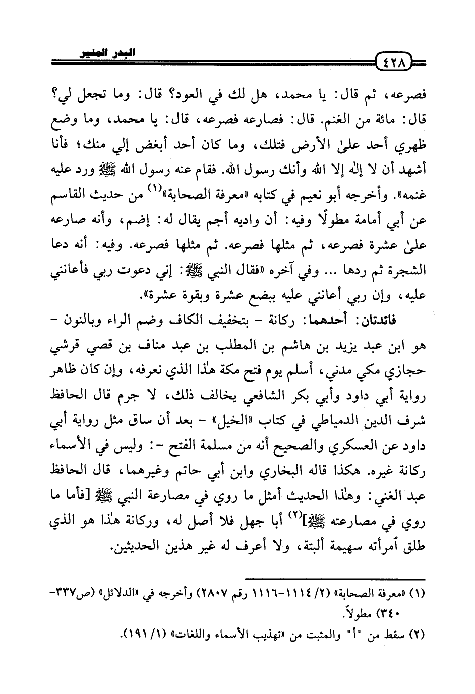 فَائِدَتَانِ: أَحدهمَا: ركَانَة - بتَخْفِيف الْكَاف وَضم الرَّاء وبالنون - هُوَ ابْن عبد يزِيد بن هَاشم بن الْمطلب بن عبد منَاف بن قصي قرشي حجازي مكي مدنِي، أسلم يَوْم فتح مَكَّة هَذَا الَّذِي نعرفه، وَإِن كَانَ ظَاهر رِوَايَة أبي دَاوُد وَأبي بكر الشَّافِعِي يُخَالف ذَلِك، لَا جرم قَالَ الْحَافِظ شرف الدَّين الدمياطي فِي كتاب «الْخَيل» - بعد أَن سَاق مثل رِوَايَة أبي دَاوُد عَن العسكري وَالصَّحِيح أَنه من مسلمة الْفَتْح -: وَلَيْسَ فِي الْأَسْمَاء ركَانَة غَيره. هَكَذَا قَالَه البُخَارِيّ وَابْن أبي حَاتِم وَغَيرهمَا، قَالَ الْحَافِظ عبد الْغَنِيّ: وَهَذَا الحَدِيث أمثل مَا رُوِيَ فِي مصارعة النَّبِي - صَلَّى الله عَلَيْهِ وَسلم -[فَأَما مَا رُوِيَ فِي مصارعته (] أَبَا جهل فَلَا أصل لَهُ، وركانة هَذَا هُوَ الَّذِي طلق امْرَأَته سهيمة أَلْبَتَّة، وَلَا أعرف لَهُ غير هذَيْن الْحَدِيثين.