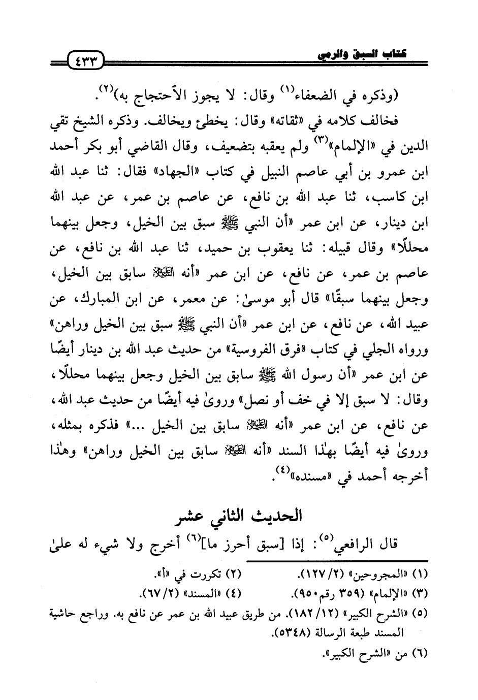 فَخَالف كَلَامه فِي «ثقاته» وَقَالَ: يُخطئ وَيُخَالف. وَذكره الشَّيْخ تَقِيّ الدَّين فِي «الْإِلْمَام» وَلم يعقبه بِتَضْعِيف، وَقَالَ القَاضِي أَبُو بكر أَحْمد بن عَمْرو بن أبي عَاصِم النَّبِيل فِي كتاب «الْجِهَاد» فَقَالَ: ثَنَا عبد الله بن كاسب، ثَنَا عبد الله بن نَافِع، عَن عَاصِم بن عمر، عَن عبد الله بن دِينَار، عَن ابْن عمر «أَن النَّبِي - صَلَّى الله عَلَيْهِ وَسلم - سبق بَين الْخَيل، وَجعل بَينهمَا محللاً» وَقَالَ قبيله: ثَنَا يَعْقُوب بن حميد، ثَنَا عبد الله بن نَافِع، عَن عَاصِم بن عمر، عَن نَافِع، عَن ابْن عمر «أَنه عَلَيْهِ السَّلَام سَابق بَين الْخَيل، وَجعل بَينهمَا سبقًا» قَالَ أَبُو مُوسَى: عَن معمر، عَن ابْن الْمُبَارك، عَن عبيد الله، عَن نَافِع، عَن ابْن عمر «أَن النَّبِي - صَلَّى الله عَلَيْهِ وَسلم - سبق بَين الْخَيل وراهن» وَرَوَاهُ الْجَلِيّ فِي كتاب «فرق الفروسية» من حَدِيث عبد الله بن دِينَار أَيْضا عَن ابْن عمر «أَن رَسُول الله - صَلَّى الله عَلَيْهِ وَسلم - سَابق بَين الْخَيل وَجعل بَينهمَا محللاً، وَقَالَ: لَا سبق إِلَّا فِي خف أَو نصل» وَرَوَى فِيهِ أَيْضا من حَدِيث عبد الله، عَن نَافِع، عَن ابْن عمر «أَنه عَلَيْهِ السَّلَام سَابق بَين الْخَيل ... » فَذكره بِمثلِهِ، وَرَوَى فِيهِ أَيْضا بِهَذَا السَّنَد «أَنه عَلَيْهِ السَّلَام سَابق بَين الْخَيل وراهن» وَهَذَا أخرجه أَحْمد فِي «مُسْنده» .